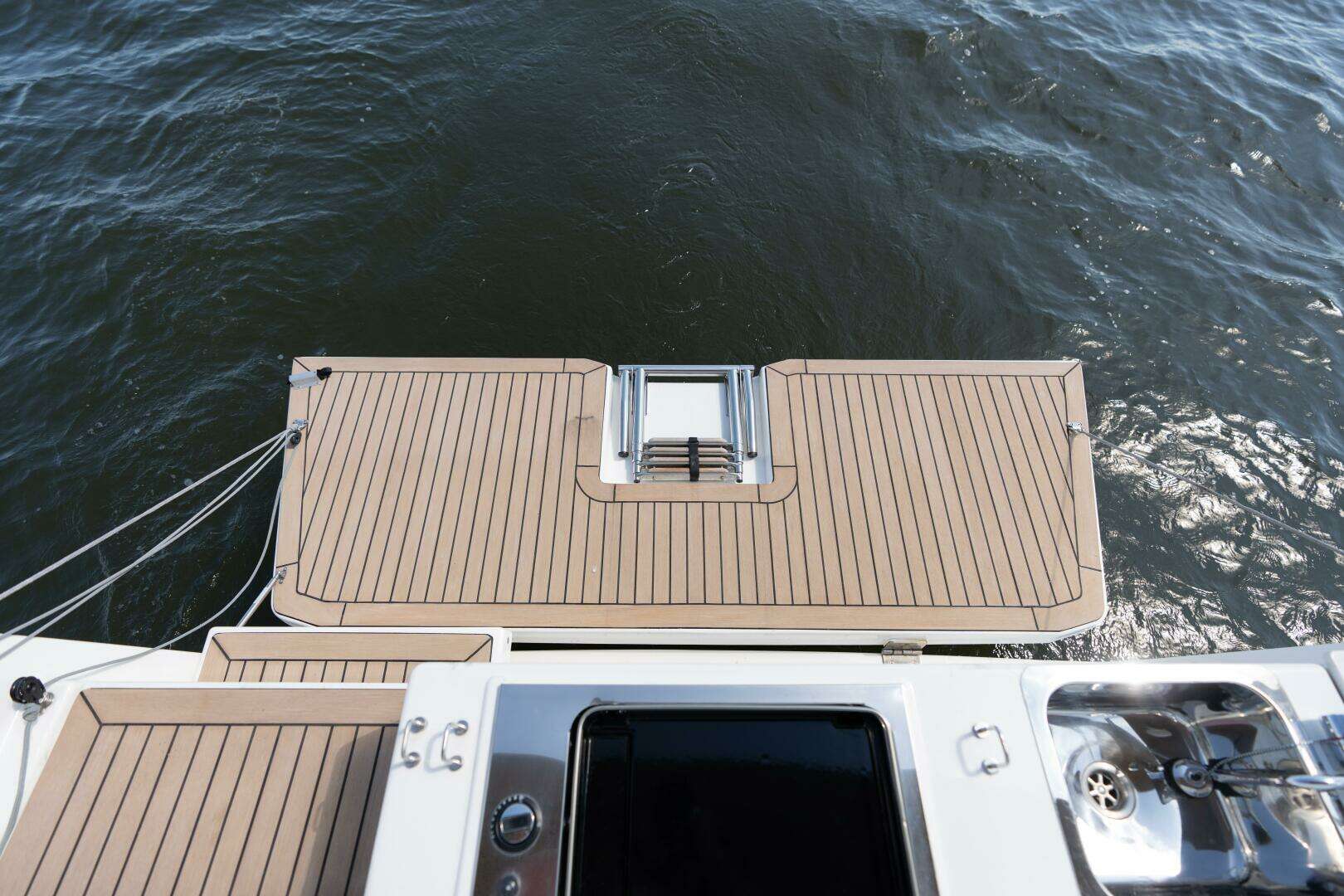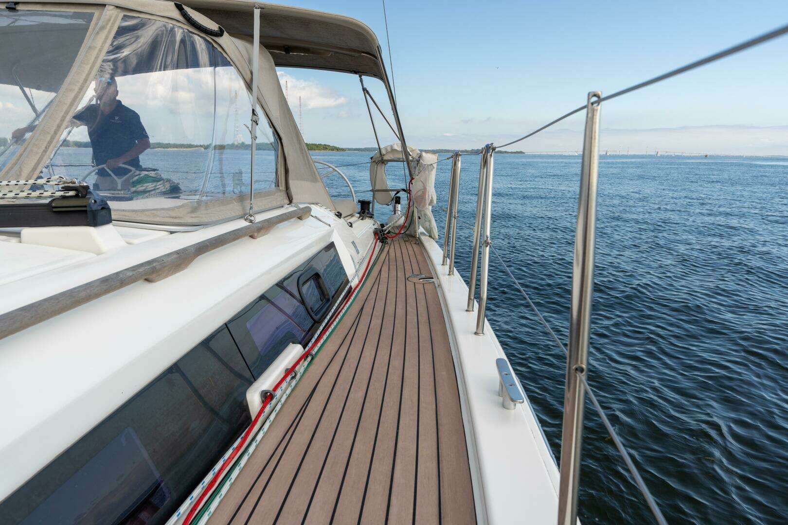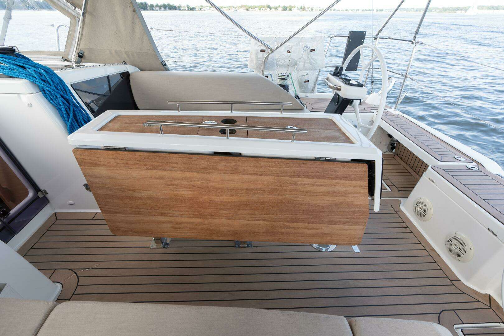 - Flexiteek synthetic teak decks (cockpit & side decks) with custom canvas (bimini, dodger, connector, LED lighting)