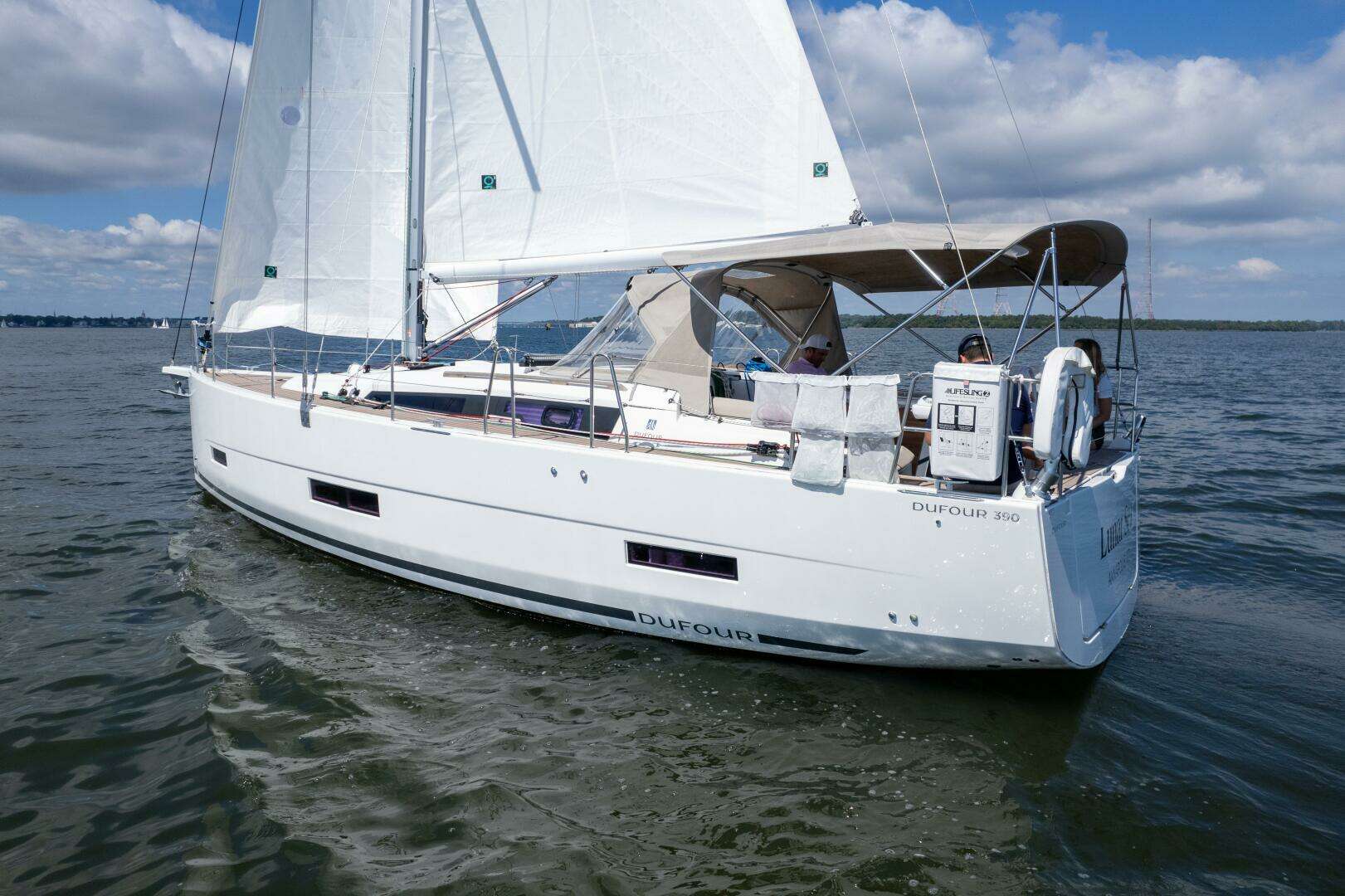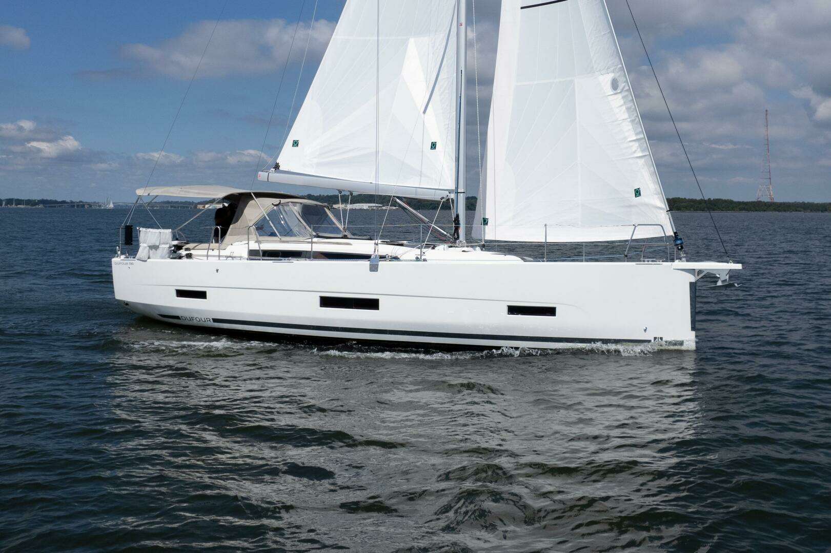 2023 Dufour 390 with two-cabin layout, Volvo 50hp, proportional bow & stern thrusters, electric winches, Flexiteek decks, Carbonautica wheels, full Raymarine suite, Quantum 2024 sails, unused Helix gennaker, Mantus anchor, A/C, davits, and Coastal life raft.