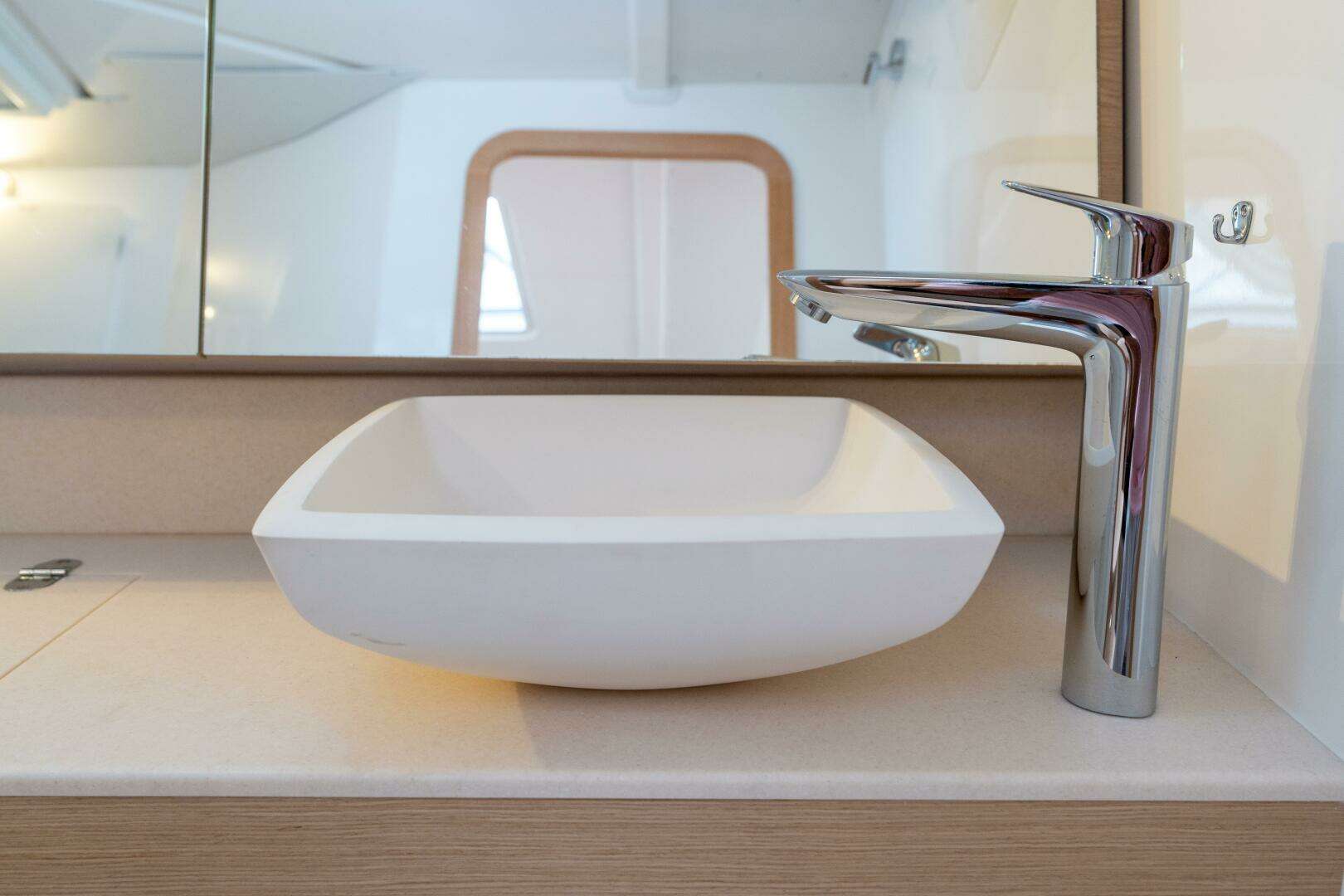 On deck, she features Flexiteek synthetic teak decking on cockpit and side decks, Carbonautica composite helm wheels, custom canvas package with bimini, dodger, connector, and integrated LED strip lighting, lifeline gates, stainless bow protection, retractable davits, outboard engine bracket, and the popular cockpit grill and sink module. A Mantus anchor system with 200’ chain, Quick chain counter & control at the helm, plus deck remote, ensure reliability and ease when anchoring. The upgraded Quantum tri-radial mainsail and 108% jib (new in 2024), plus a never-used North Sails Helix furling gennaker (~$6,000 value), round out a premium package that enhances performance and versatility.