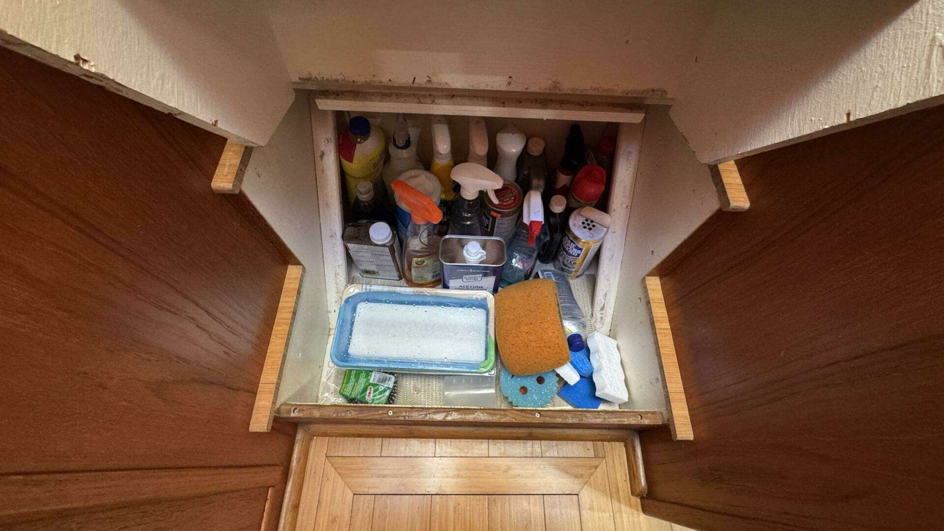 The port guest stateroom offers side-by-side berths and is currently used as a highly functional storage and pantry space.
