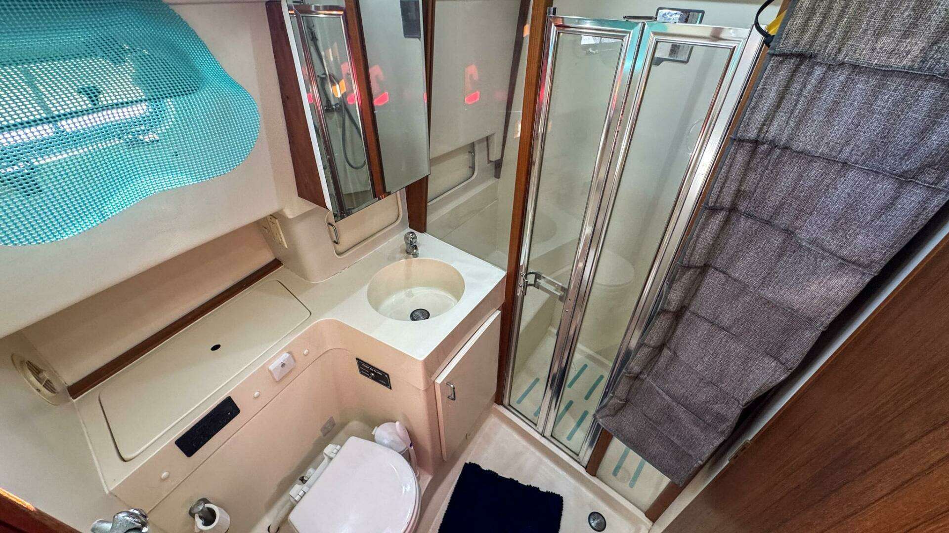 The head is to starboard and features a separate enclosed shower.
