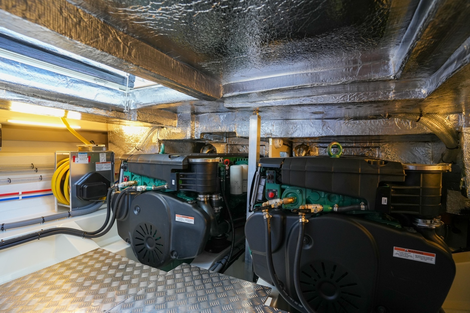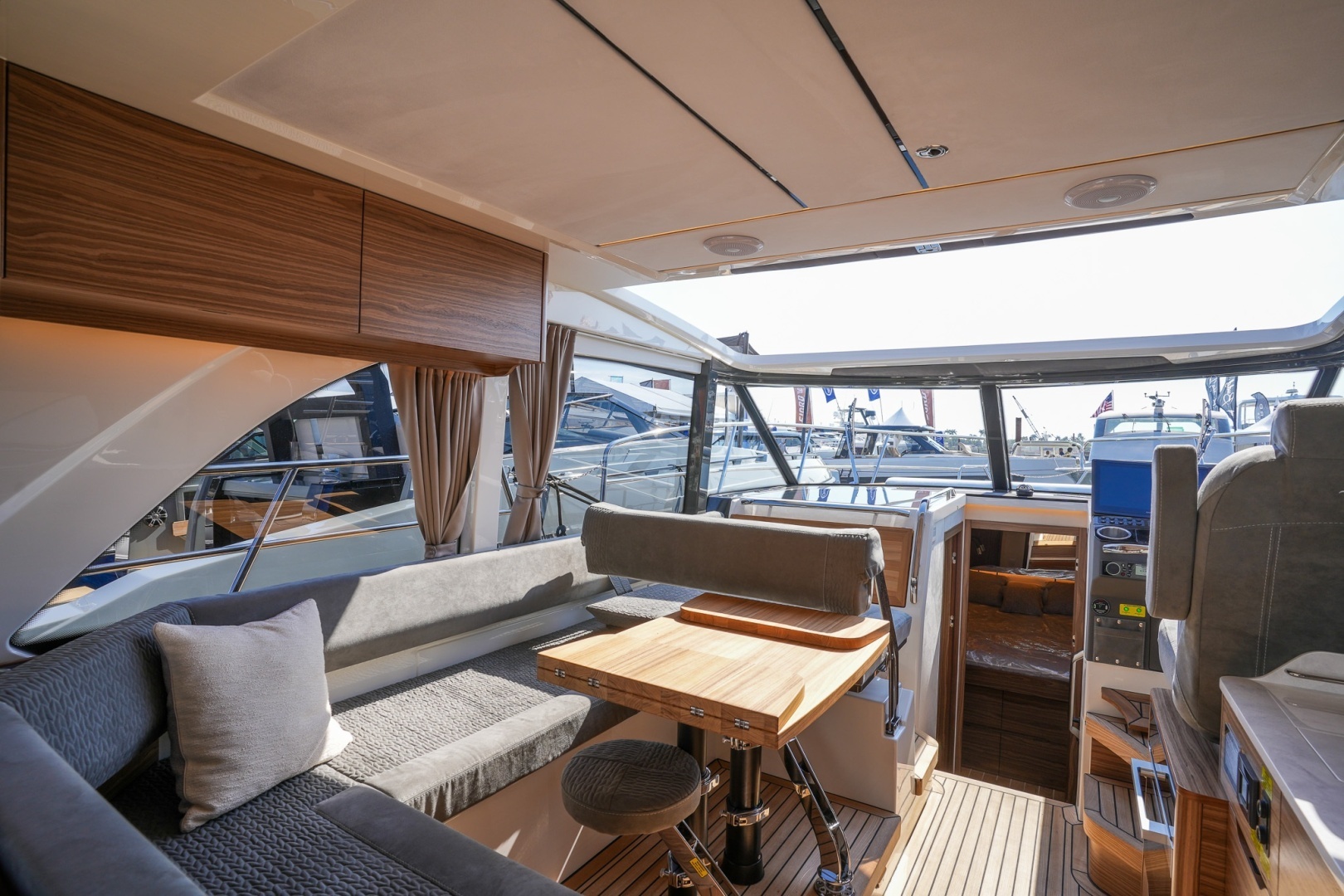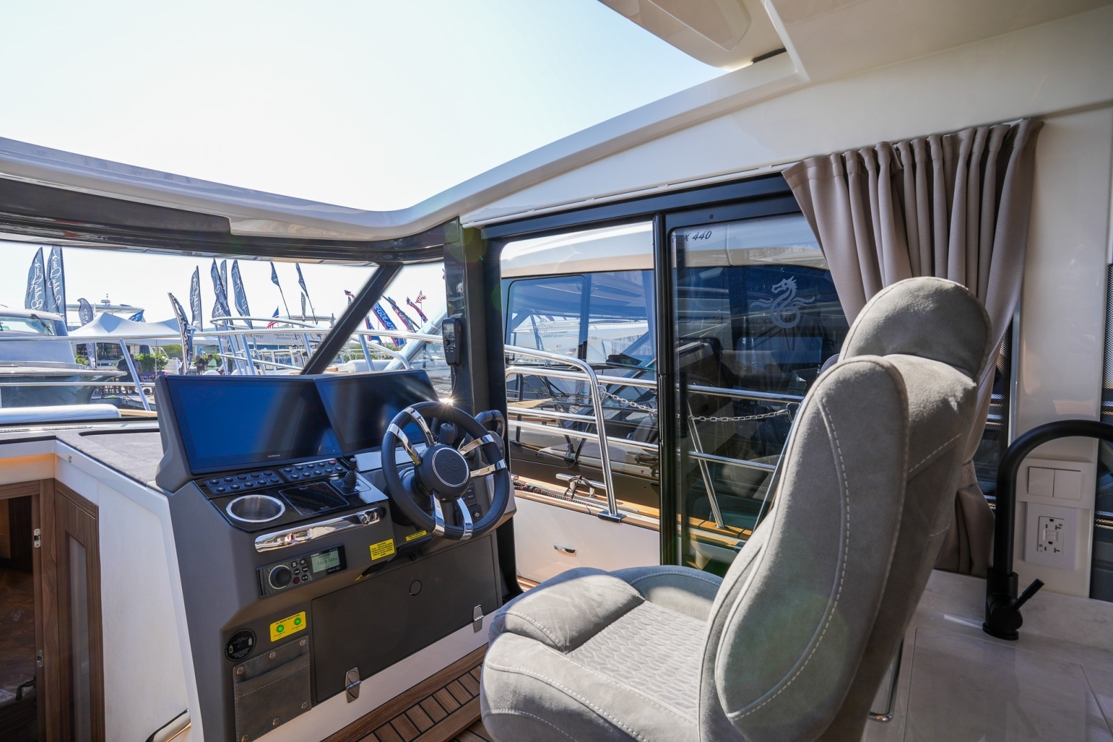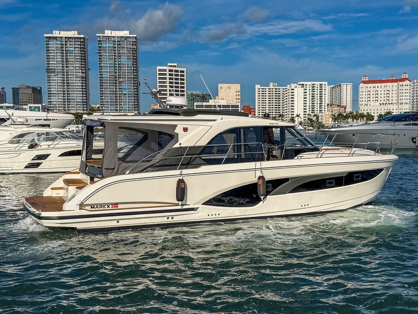 The Marex 390 is available with several engine options to suit different cruising needs. Owners can choose between single or twin sterndrives, or with shaft drive motorization coming later. Fuel and water tank capacities are generous, making the boat well-suited for longer trips at cruising speed. For added convenience, anew pilot door provides easy access to the side deck ,simplifying docking and maneuvering while also enhancing onboard ventilation