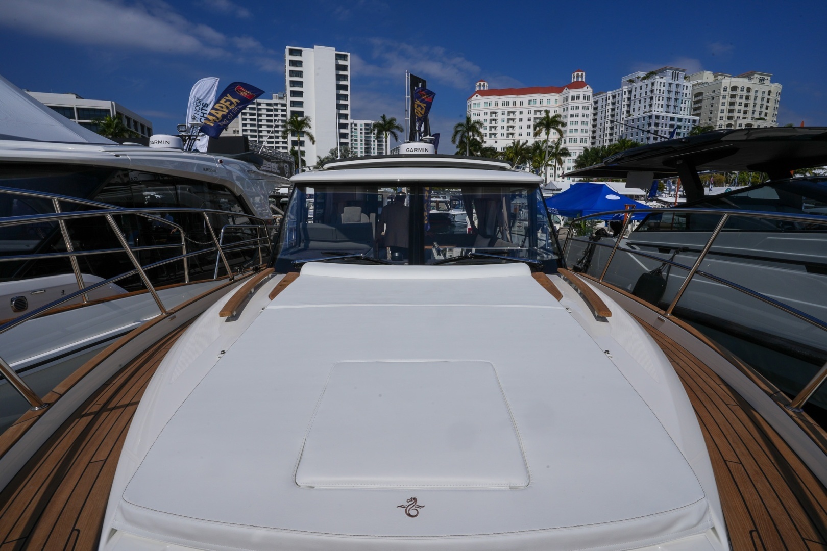 Marex has always prioritised functional design. The swim platform benches on the Marex 390serve a dual purpose: they provide seats next to the water and offer expansive stowage for fenders, lines, and toys. The new cockpit transparent door lets in more light and makes docking in harbors easier, while also keeping a connection to the sea. The foredeck’s hatch has a hidden bow sprit to be easily flipped out, making access to land from the bow easy. The sunpad also serves as a floating toy, a feature that is very popular among families. The adjustable back rest of the mattress allows it to be used as a chaise lounge. The Marex signature enclosure, the Smart Canopy System, remains a highlight. The side curtains can be deployed in seconds, and together with two sliding roofs, the boat can be adapted to various weather conditions