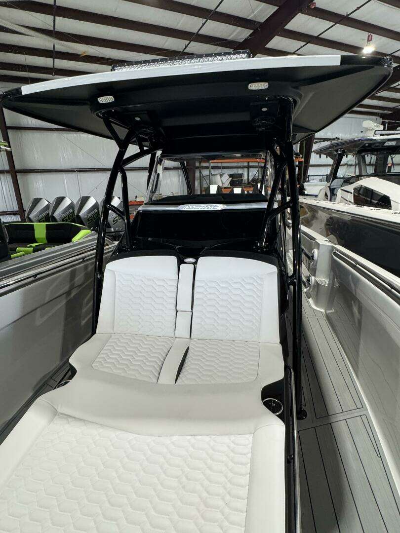 Black gelcoat bottom w painted white hullsides and deck. Powred by triple Mercury Racing V-10 400R's and Loaded with options such as Isotta Intelligent Steering wheel, Smartcraft Vesselview, Coast Key, 280 K-planes, reverso auto engine flush, 2 22" Garmin 9222's, 30" Black Oak LED light bar, full @jl_audio_usa stereo system ( 8 M6 7.7 speakers, 6 M6 8.8 speakers, 3 M6 10" subs, 1 M6 12" sub, 3 MV 1000/1 sub amps, 1 MV800 8i Amp. Lumishore underwater lights, 1Kw transducer, VHF radio, bow thruster, Cabin Air Conditioning, @sureshade power retractable sunshade, power retractable bow table, club sport rear AND 2nd row seating, hexagon elongated Capriccio White interior w black accents and much much more. She'll cruise nice in the mid 40's getting 1.5 mpg and will run well into the 80s when you want to stretch it out!!