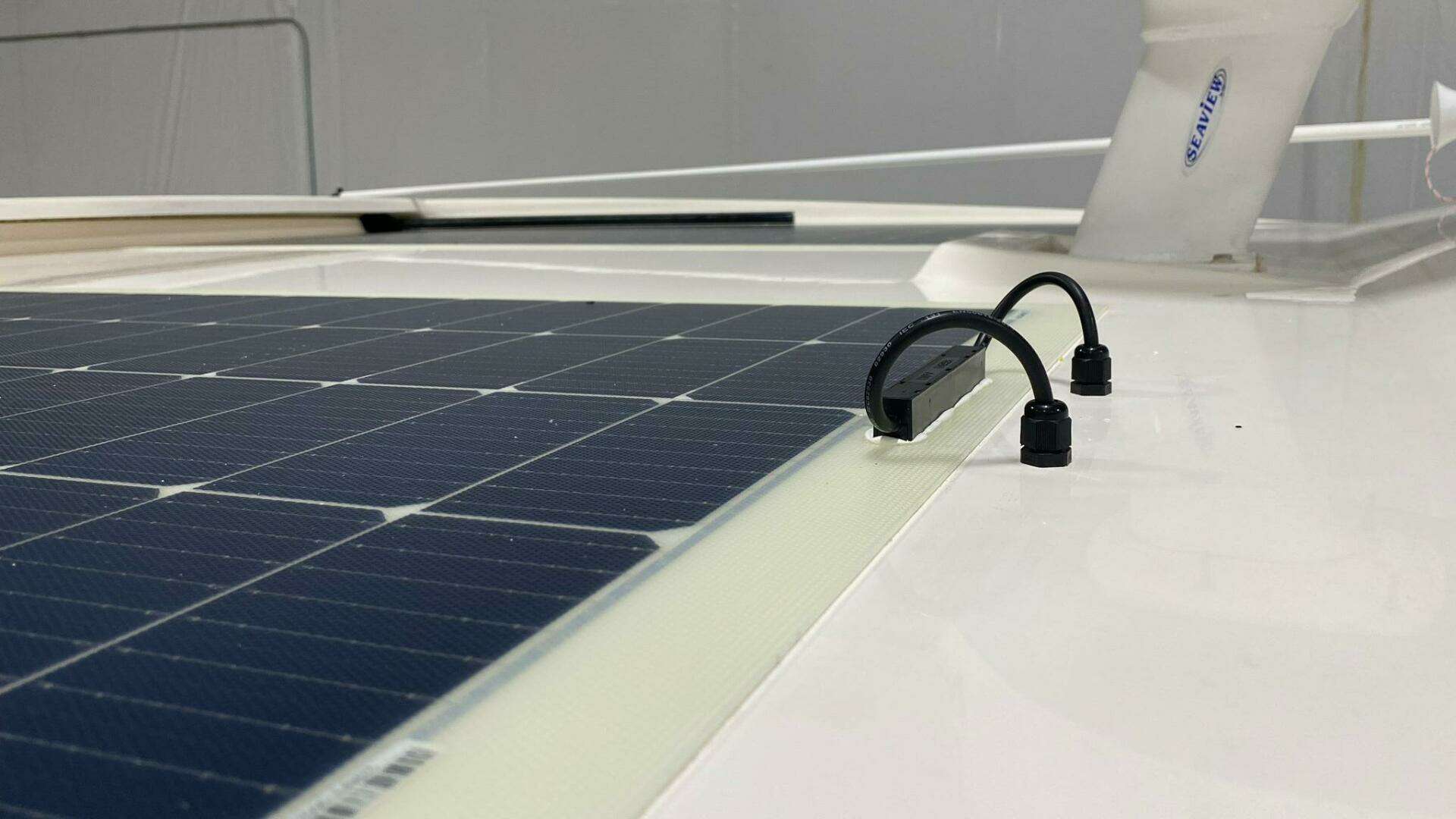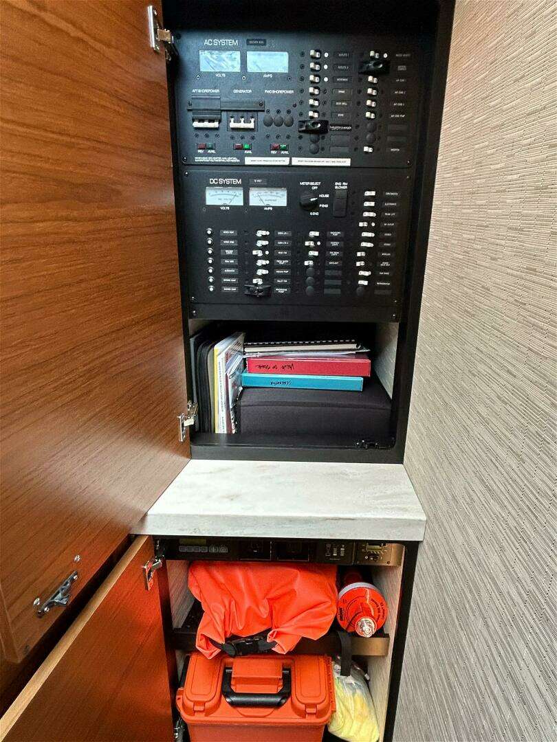 For extended time on a mooring or at anchor, the vessel is equipped with an expanded AGM house battery bank and 400W solar array (installed in 2024), allowing continued operation of the refrigerator and other DC systems without relying heavily on the generator. Additional updates include a new Isotherm fridge (2024), new cockpit upholstery (2023), and a new Hurley davit system (2024).