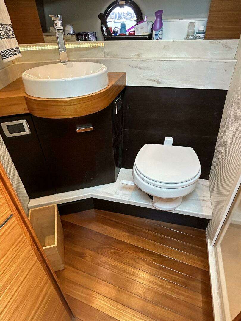 - Two-stateroom layout (forward queen berth; aft cabin with full queen berth)