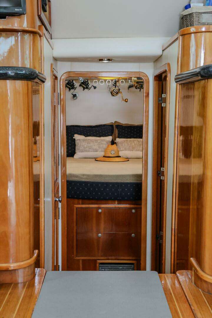 - 3 steps down companionway you have an over/under bunk room to starboard and head to the port with enclosed shower forward stateroom has centerline bed with storage drawers underneath two (2) hanging lockers and outboard storage bins down both sides of the bed. Water tight crash bulkhead forward of stateroom.