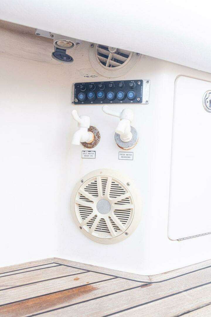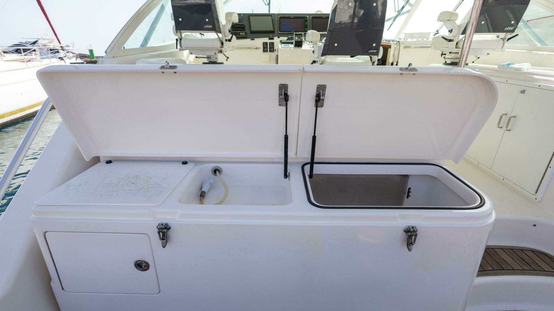 Standard features include a molded bow pulpit, teak-and-holly Cabin sole, recessed trim tabs, 48-gallon transom live well, fresh water / raw water washdowns, Cockpit bolsters, insulated in-deck fish boxes, bait prep center, lockable rod storage, bait freezer and transom door.