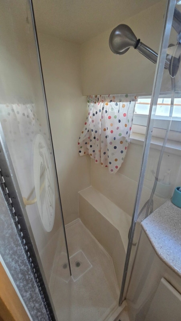 The primary stateroom offers an offset queen berth, generous storage, and a private ensuite head with a separate stall shower.
