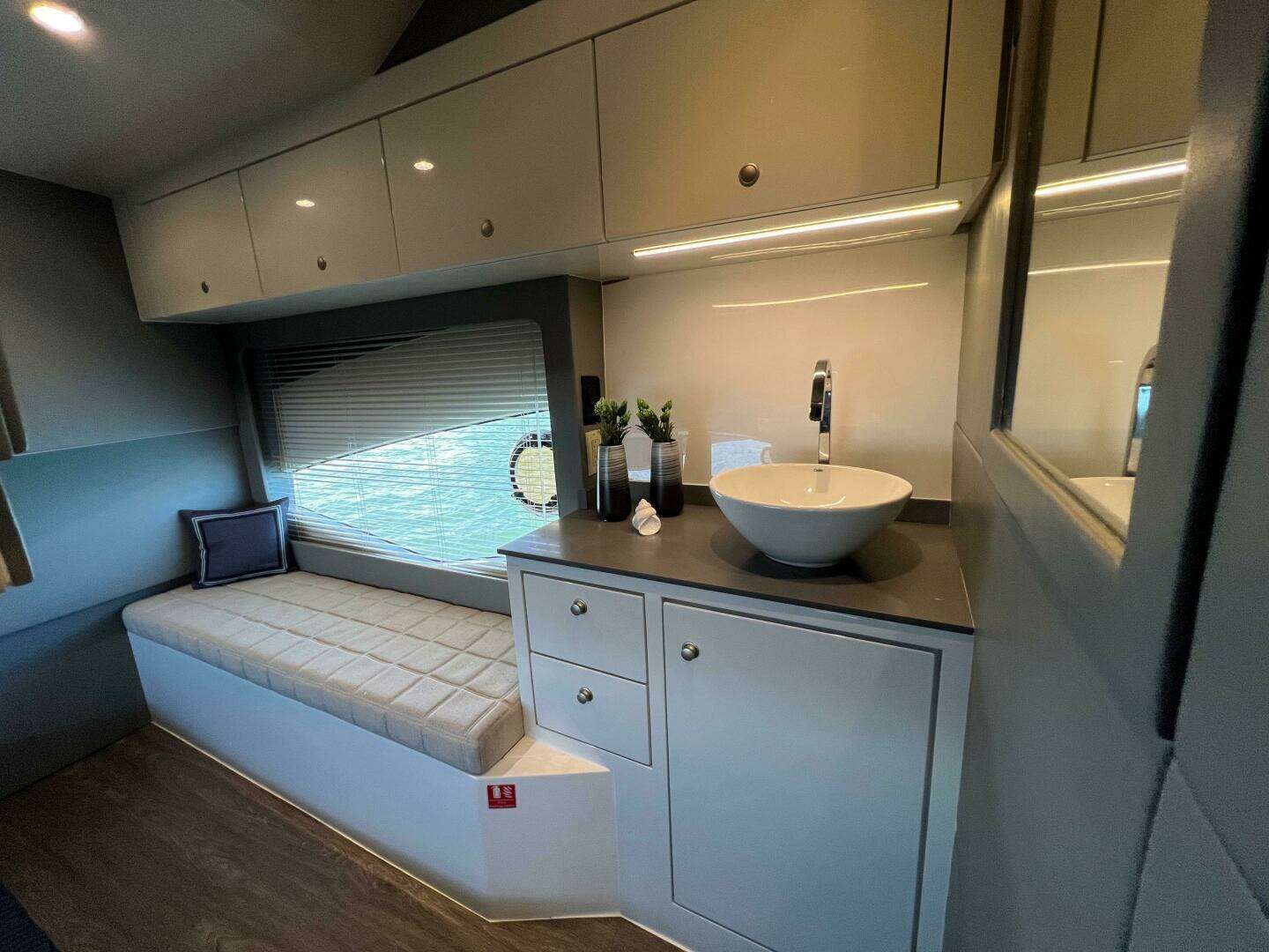 This configuration features a well-appointed single stateroom, perfect for privacy and comfort, and an innovative open bedroom tucked cleverly under the stairs. This layout maximizes space while maintaining a stylish and inviting atmosphere for overnight guests. The high-end finishes throughout include non-staining, non-fading, anti-slip EVA flooring extending across the cabin, cockpit, and swim platform, ensuring practicality and modern aesthetics.