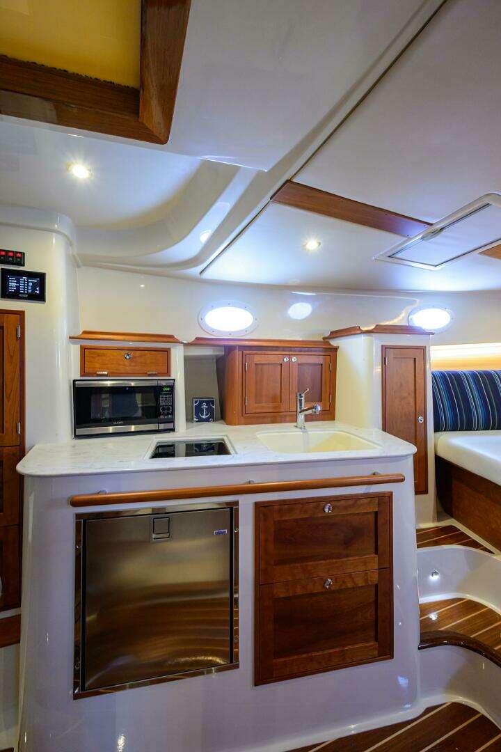 - Galley with refrigeration drawer, microwave, cooktop, sink, and coffee system