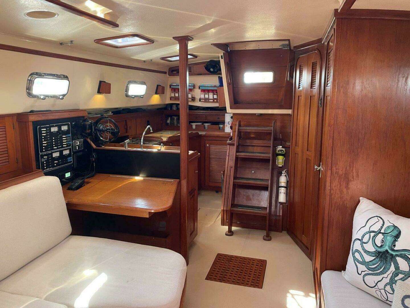 The salon was designed with comfort and safety in mind, equipped with four opening ports, four deck vents, two opening hatches, and overhead handrails. There is a single settee to port and an L-shaped settee to starboard, which pulls out to become a double berth. A drop-leaf table folds down from the forward bulkhead, revealing a storage/wine rack. Cabinets and bookshelves are positioned outboard of both settees, with large storage areas behind and beneath each settee.