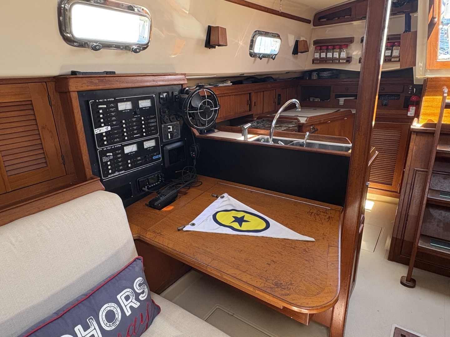 The navigation station is located on the starboard side, between the salon and galley. It includes a hinged table with storage underneath, chart storage below the settee, and houses the master AC-DC electric panel and electronics equipment.