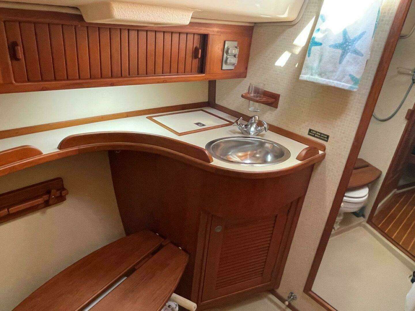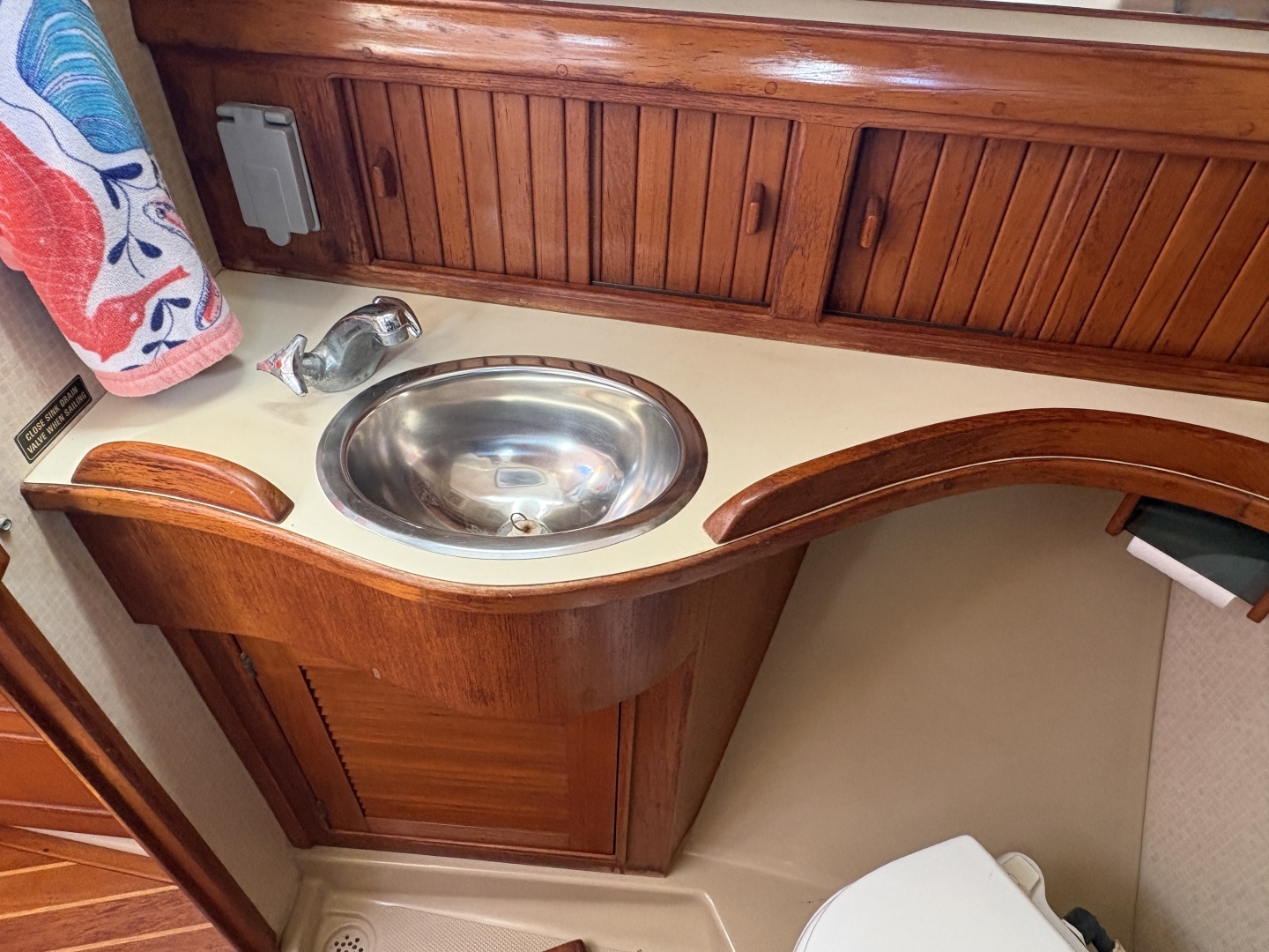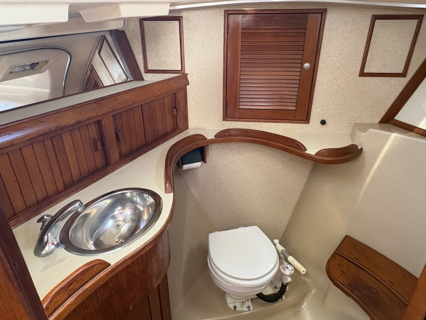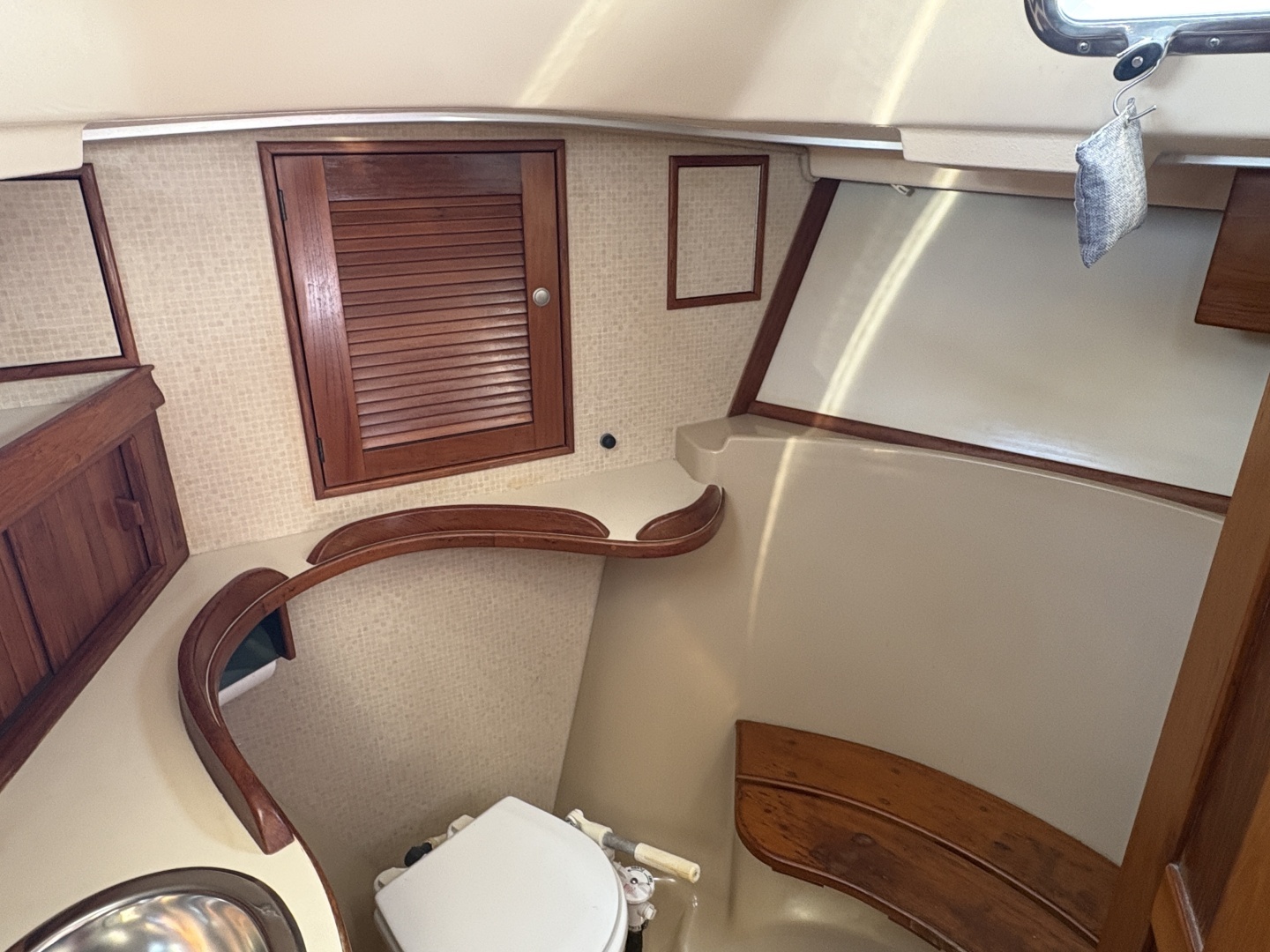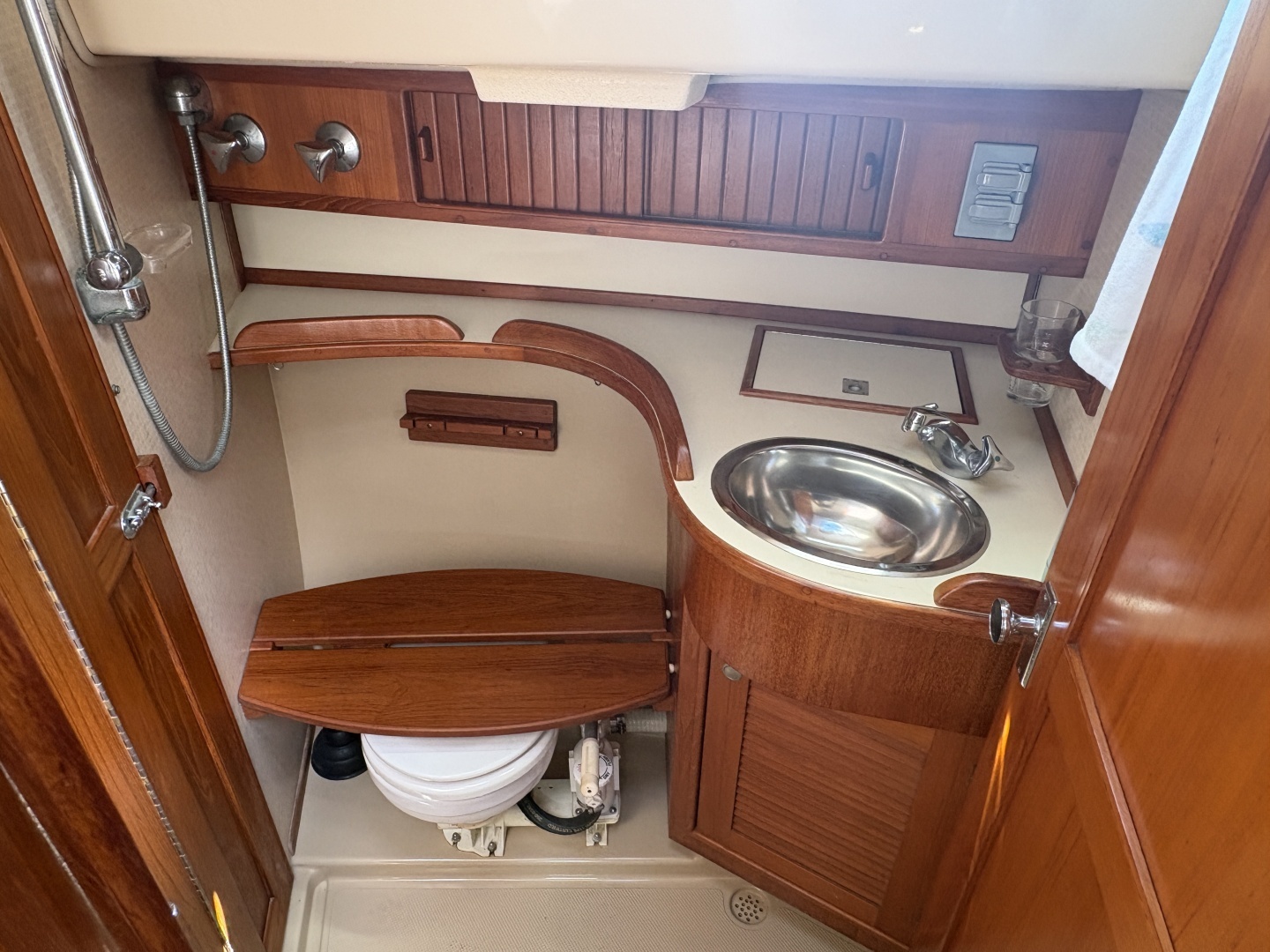 The forward cabin is located aft of the chain locker. It includes a large vanity with a stainless-steel sink, a teak shower seat, a curtain-enclosed shower, a head, storage cabinets, hot and cold water, a mirror, two opening ports, and an overhead hatch.