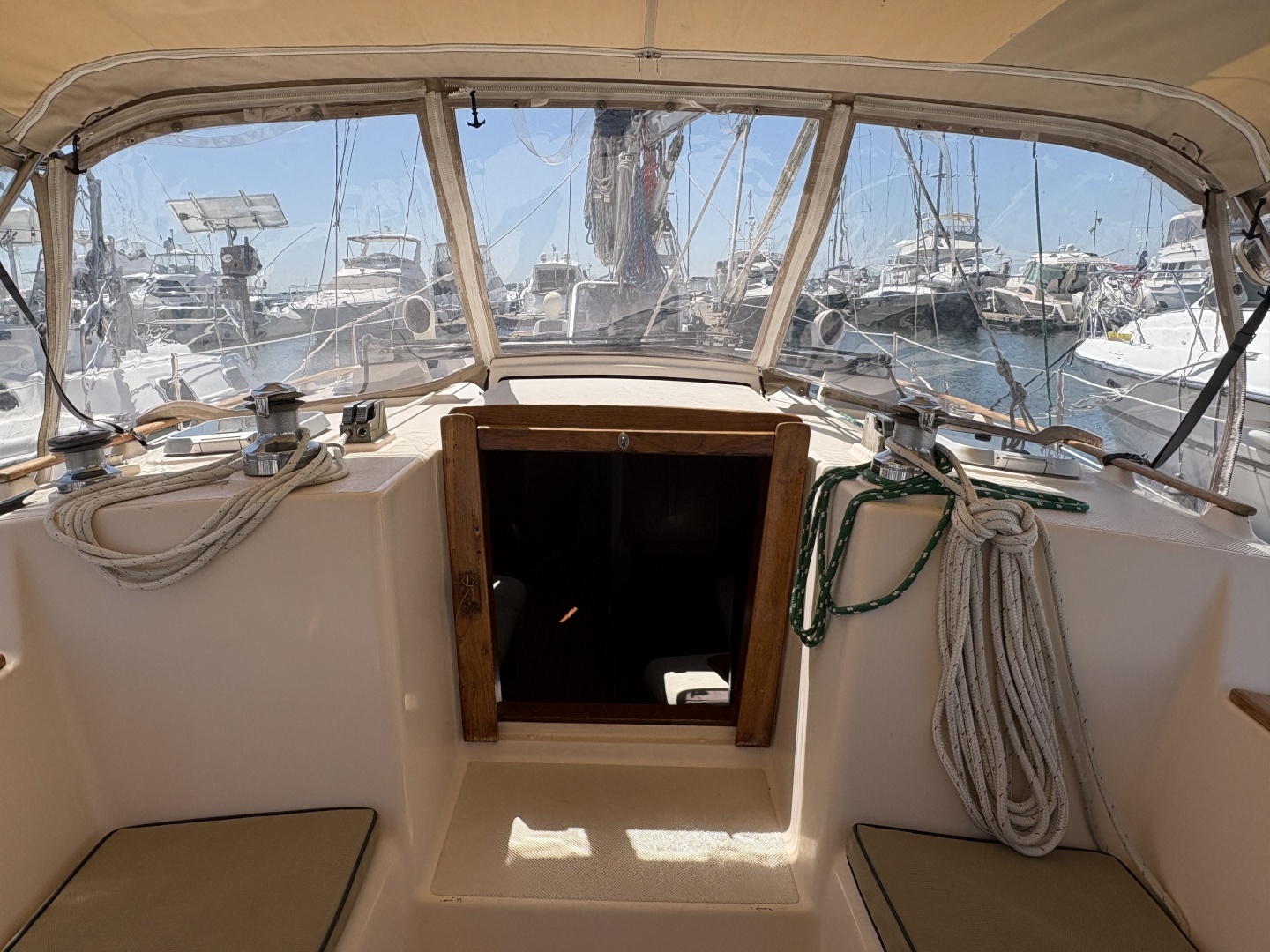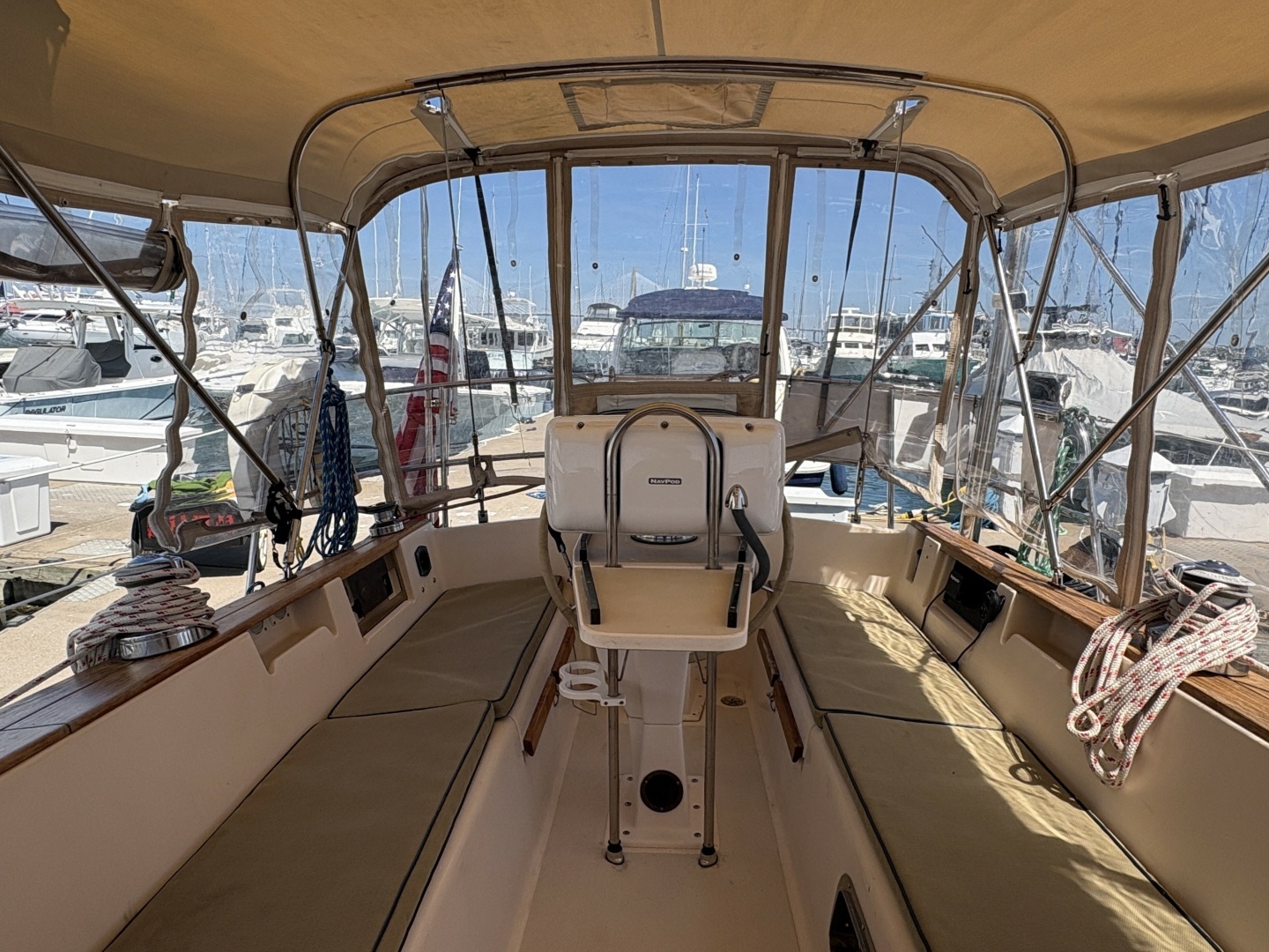 The interior of the Island Packet 40 is both attractive and functional, showcasing quality teak joinery and a teak and holly cabin sole. It features two private cabins, two heads, a comfortable salon, a convenient navigation station, and a secure galley. Natural light and ventilation are abundant, provided by thirteen stainless steel opening ports with new screens, seven new deck hatches, and four deck dorades.