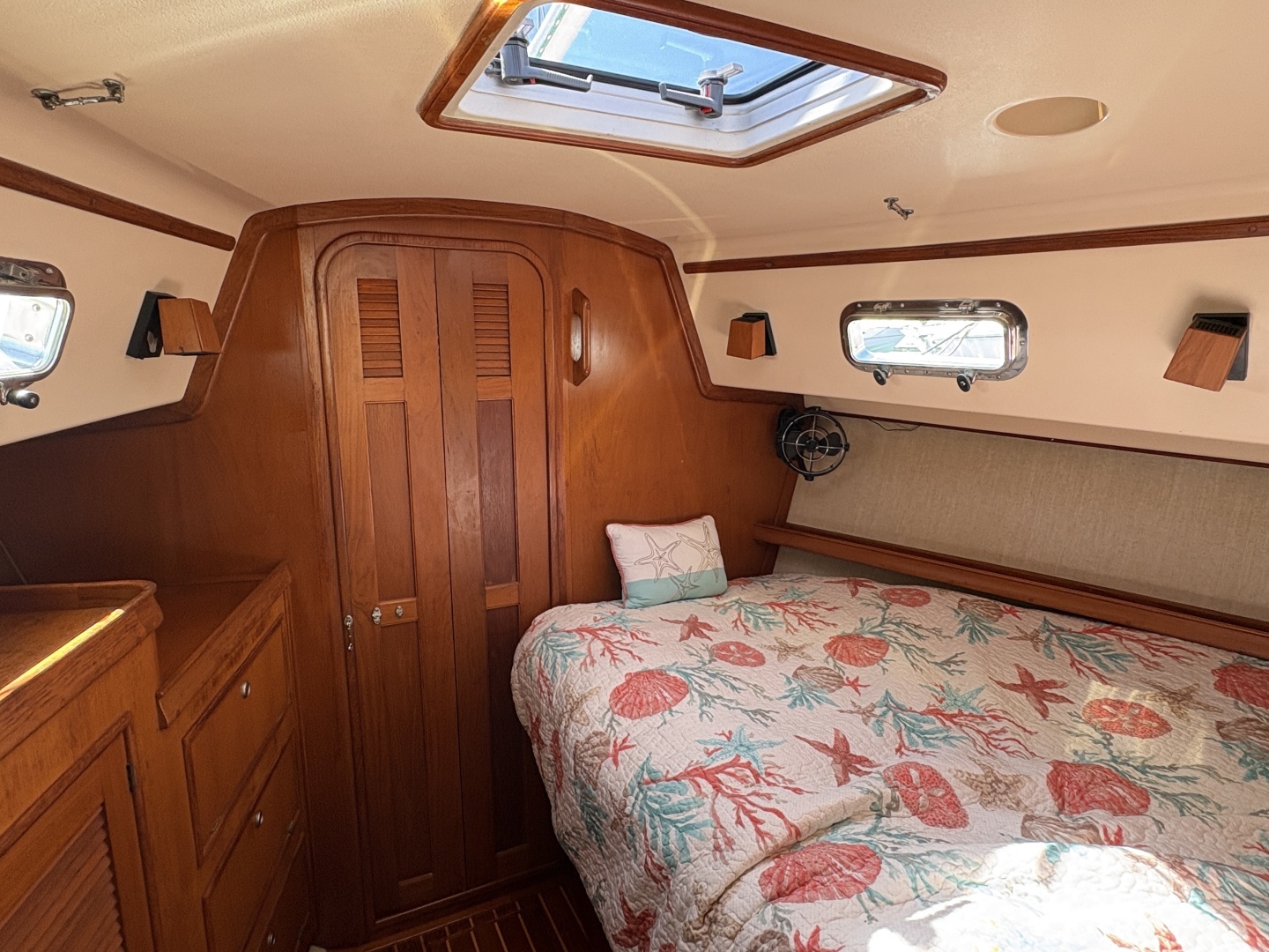 The forward cabin has three opening ports, deck vents, and a single hatch. It features a large double berth on the starboard side, complemented by teak shelves on the headboard and outboard. Storage is generous, thanks to the spacious cedar-lined hanging locker and drawers.