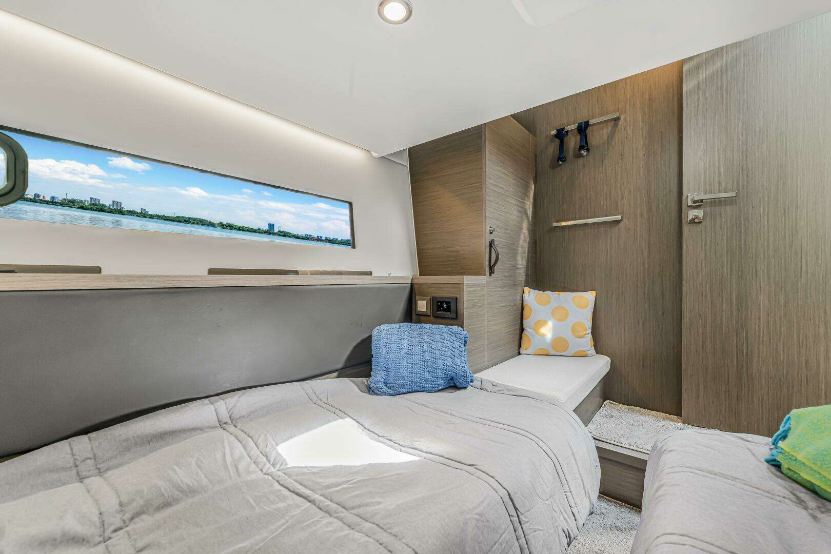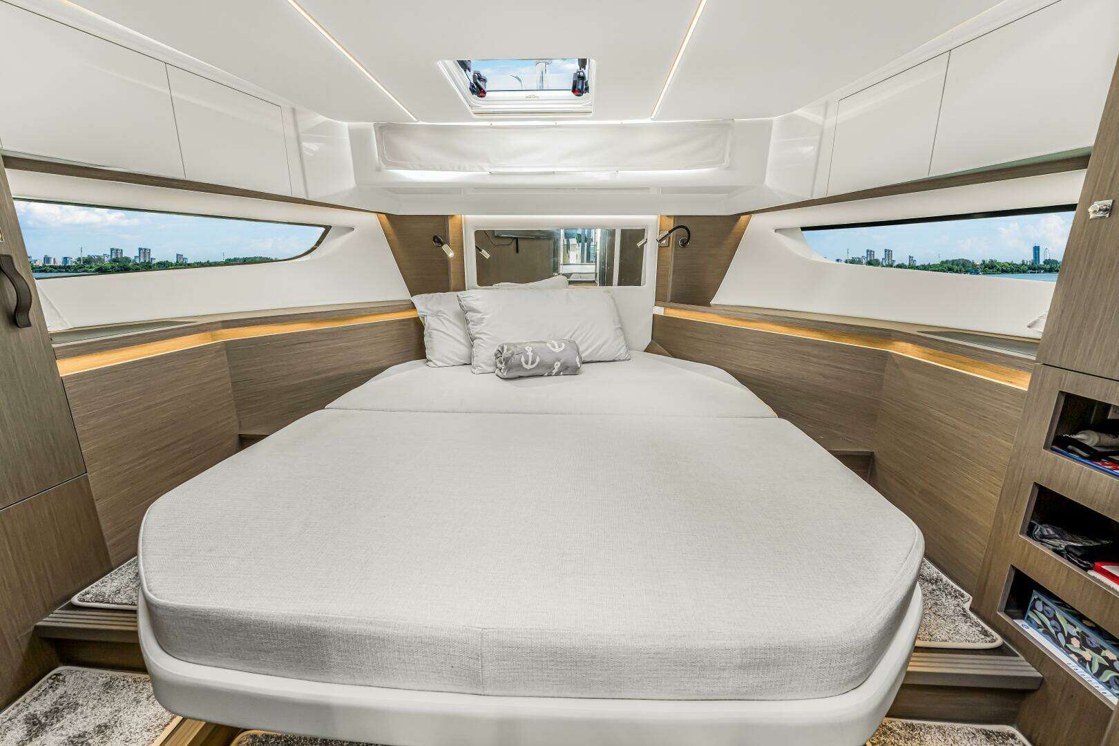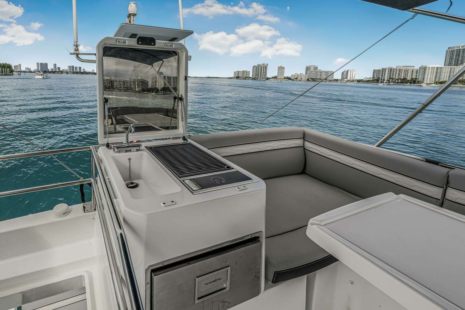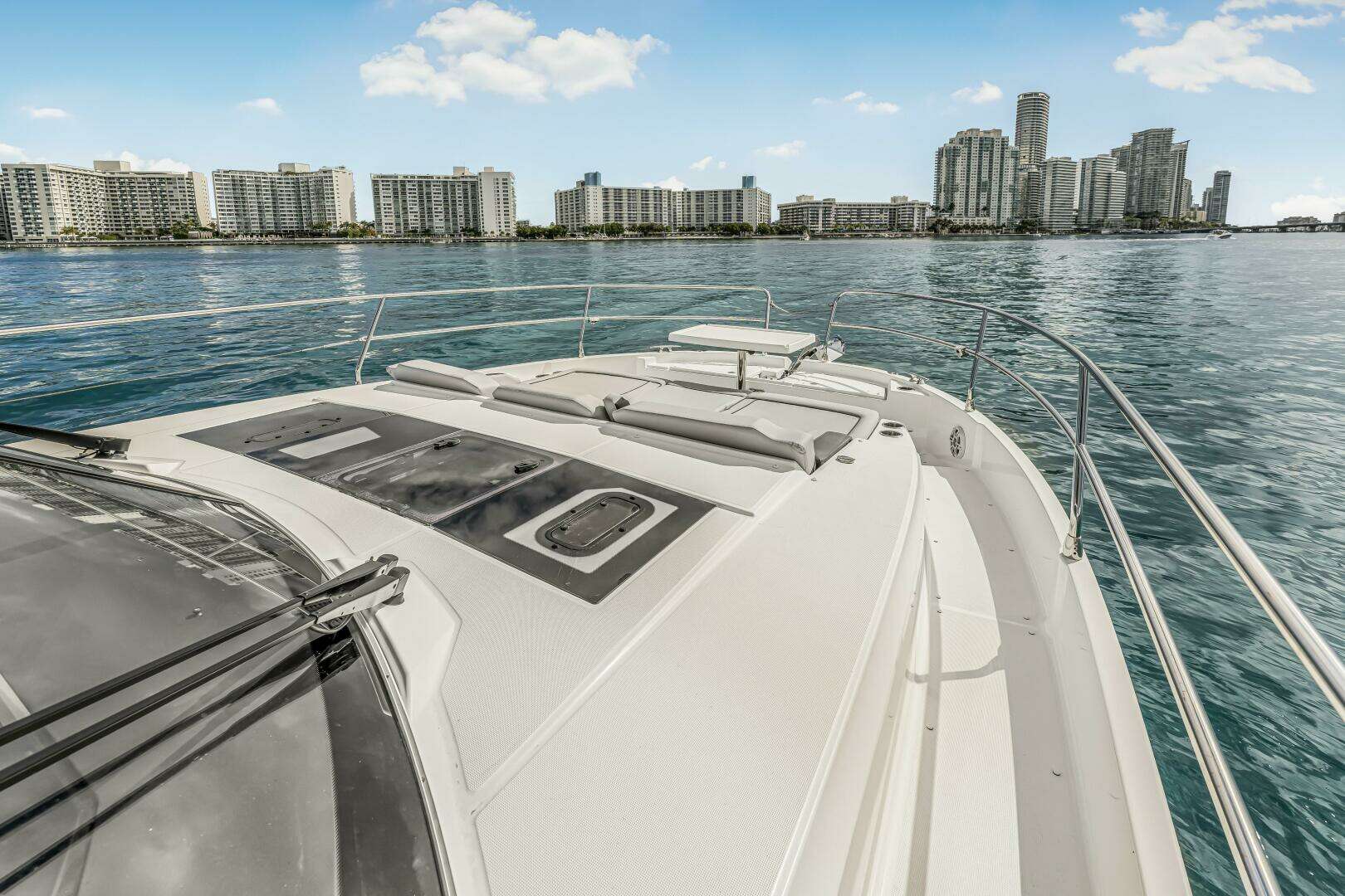 The foredeck sports three sunpads each with armrests with holders. To protect from the sun the aft cockpit has an electric extending awning and a forward sunshade. Owners can easily stow water toys or even a few cases of wine. This boat is outfitted with a Seakeeper 3 and a 3-kW Fischer Panda genset.