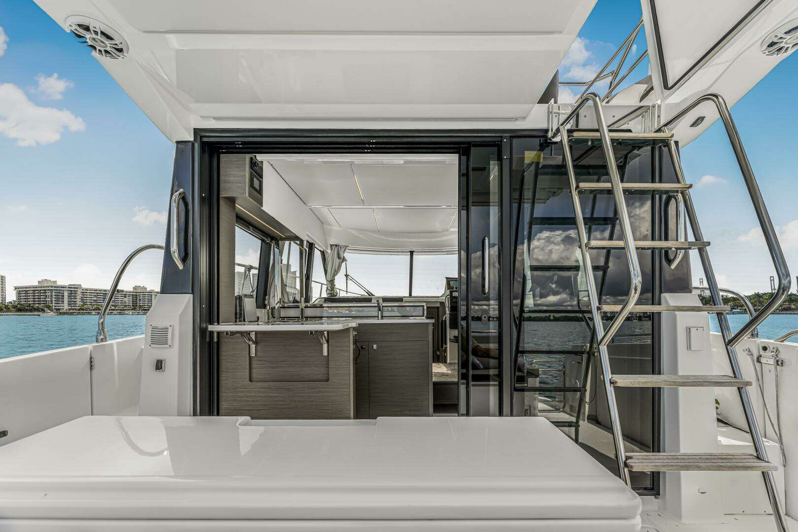 The NC1295 has a large fold-down cockpit or terrace. A large section of the starboard coaming creates a terrace with a swim ladder giving the owner the option to get on or off the boat. The terrace makes for easy boarding (via a boarding door to port) from the water, the dock or a tender. She is powered by triple 300-hp Yamaha outboards with Joystick and a bow thruster.