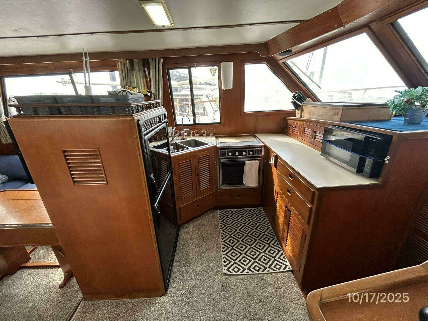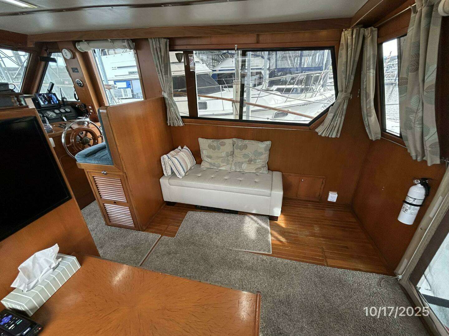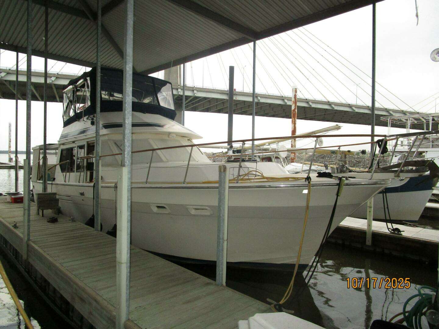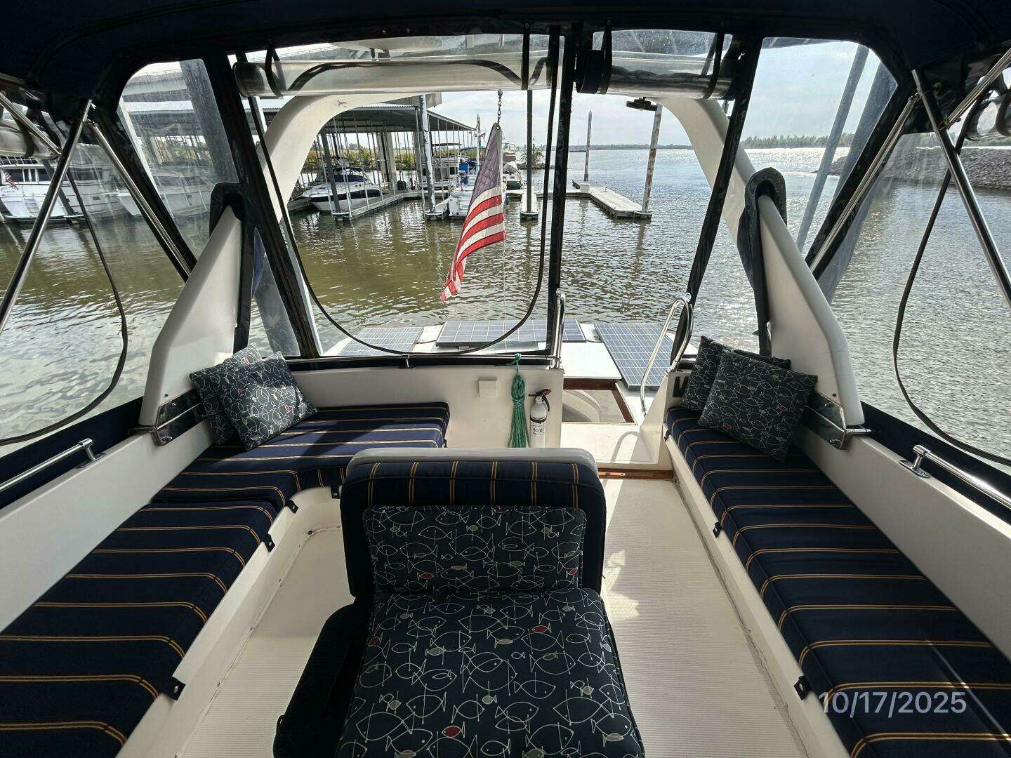 From the teak swimplatform, you enter the hardtop covered aftdeck via the transom gate. Once inside the aftdeck, you will find molded-in steps to each side deck, a stainless steel & teak ladder to the flybridge or you step into the salon via the sliding teak & glass door to the salon. Once inside the salon, you will find a benchseat starboard aft, lower helm with side deck access door starboard forward, L-shaped seating with storage and a hi/lo folding teak table port aft and galley port forward. Walk forward and step down the companionway to find the guest stateroom to port, master stateroom forward and head with a 1/2 tub/shower to starboard.
