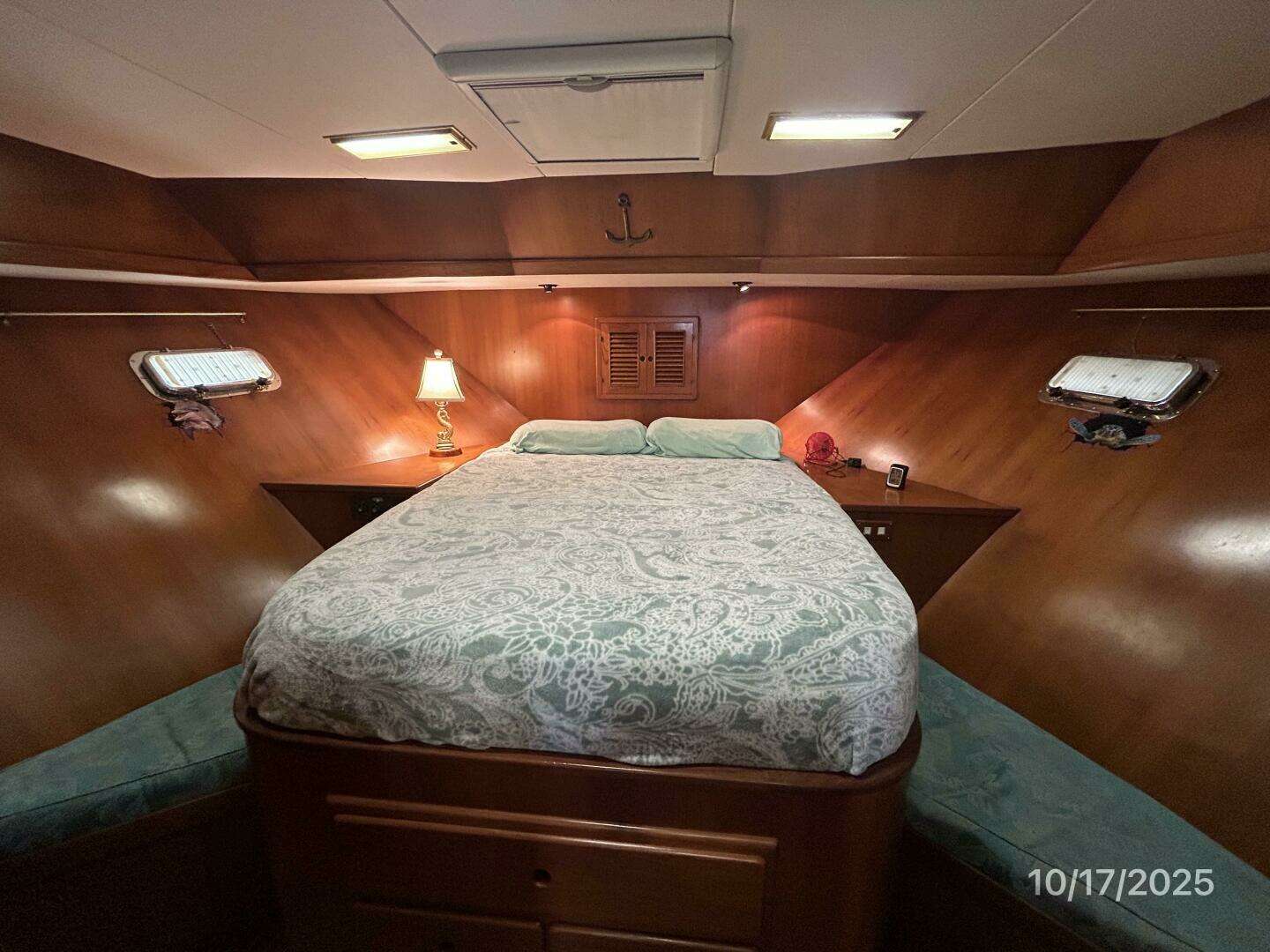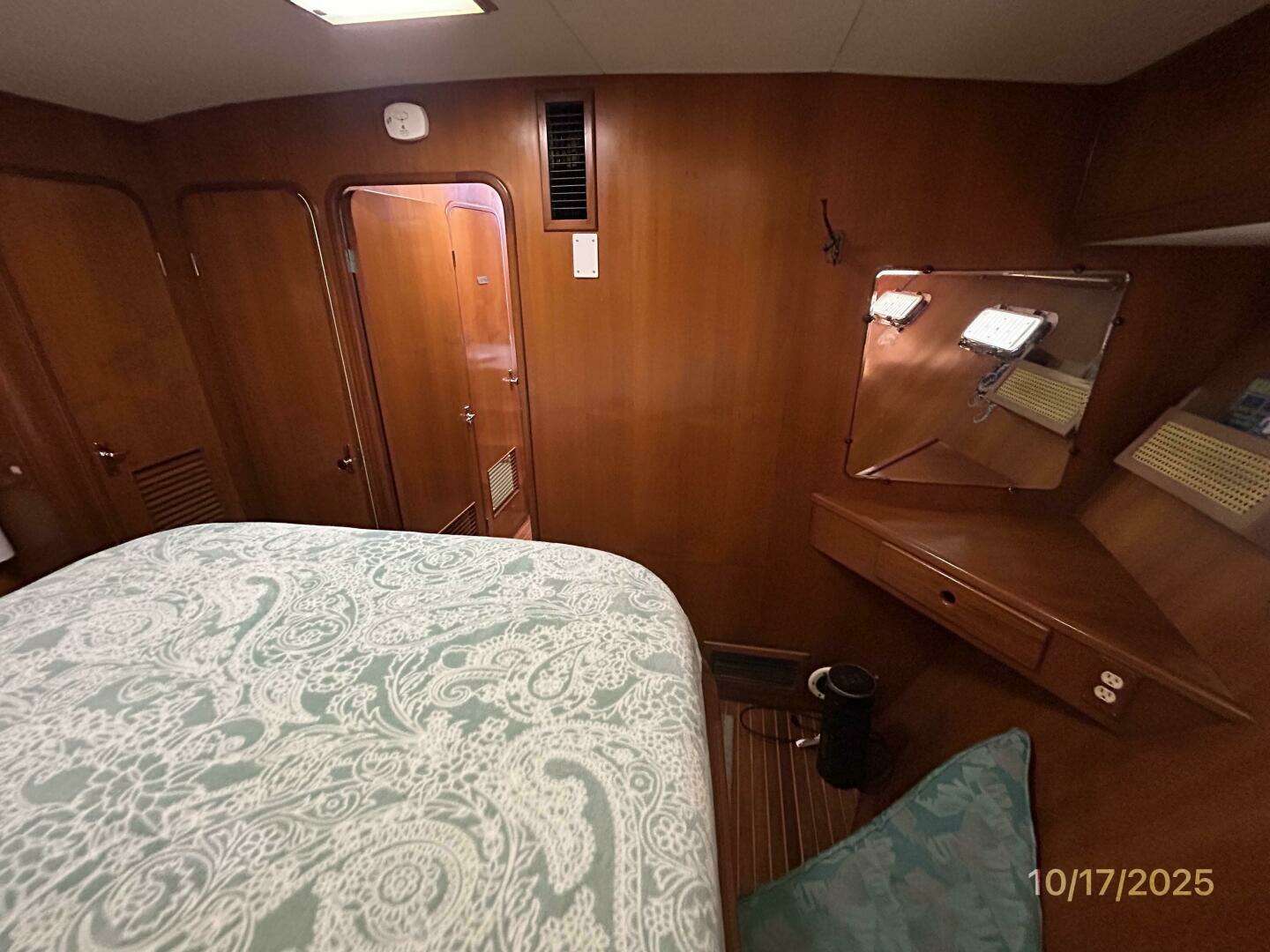 The master stateroom is forward and offers an island queen size berth (High quality custom mattress), nightstands, reading lights, 4 portlights with Clozures blinds, overhead hatch with an Oceanair screen/shade, teak & holly sole, a benchseat with storage on each side, book shelf, mirror, corner desk, hanging locker/cabinet, storage drawers, storage under the berth, anchor chain locker access and direct access to the starboard aft head and 1/2 tub/shower.