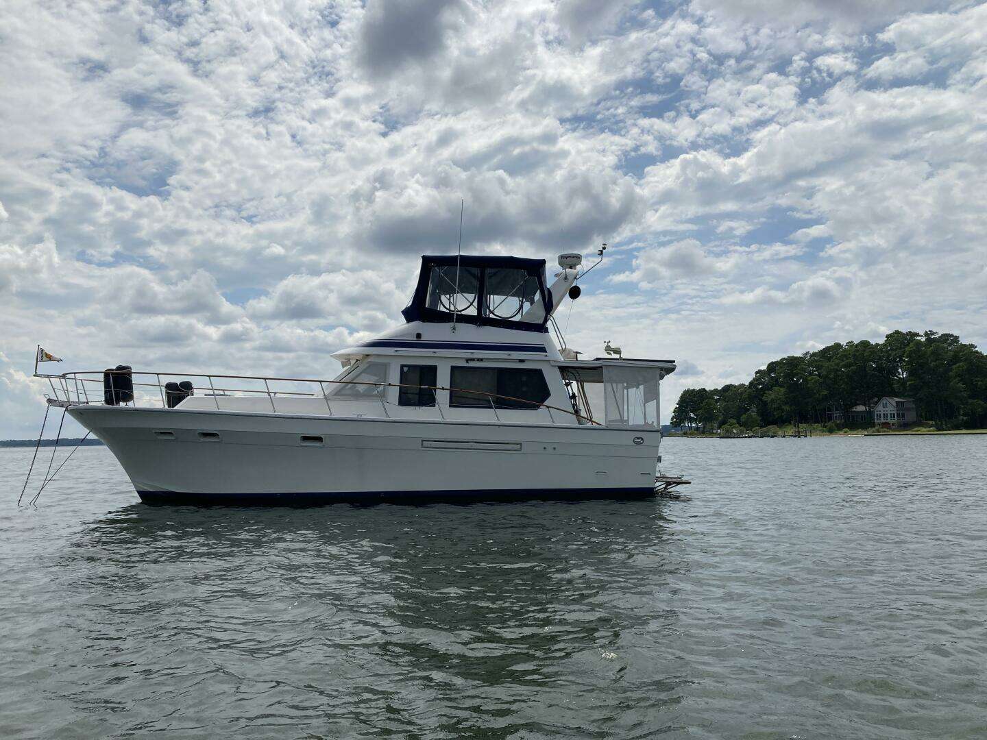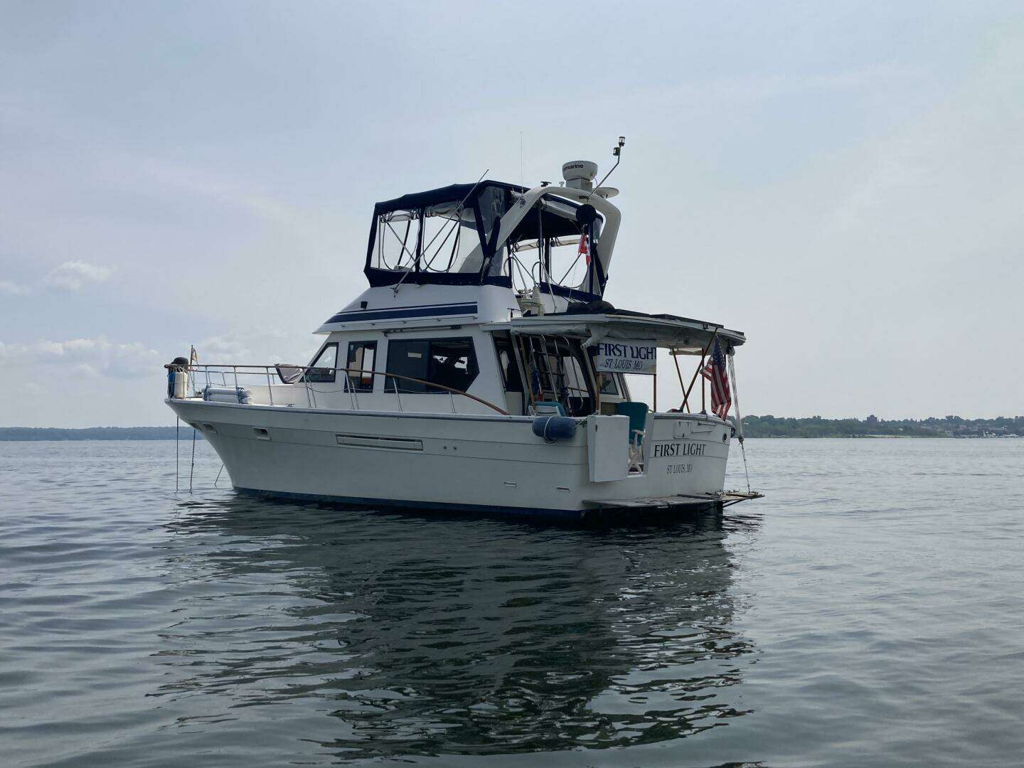 First Light is a 1988 40' Kha Shing flybridge sedan. She offers twin Cummins 150-155 HP main engines (Starboard original and port re-manufactured in 2010), Onan 8 kW generator, Tides dripless shaft seals, solar panels, hinged Radar arch, hardtop covered aftdeck, galley on the main deck and a two stateroom layout. First Light is a Great Loop veteran and has an attainable height above the waterline of 13'4".