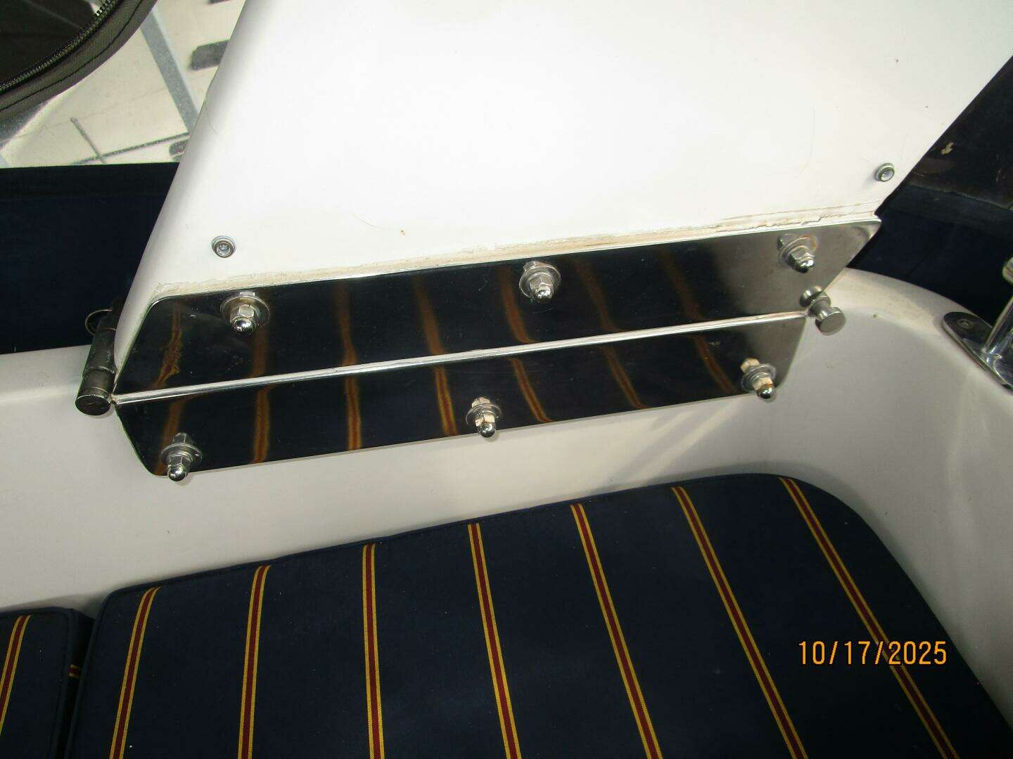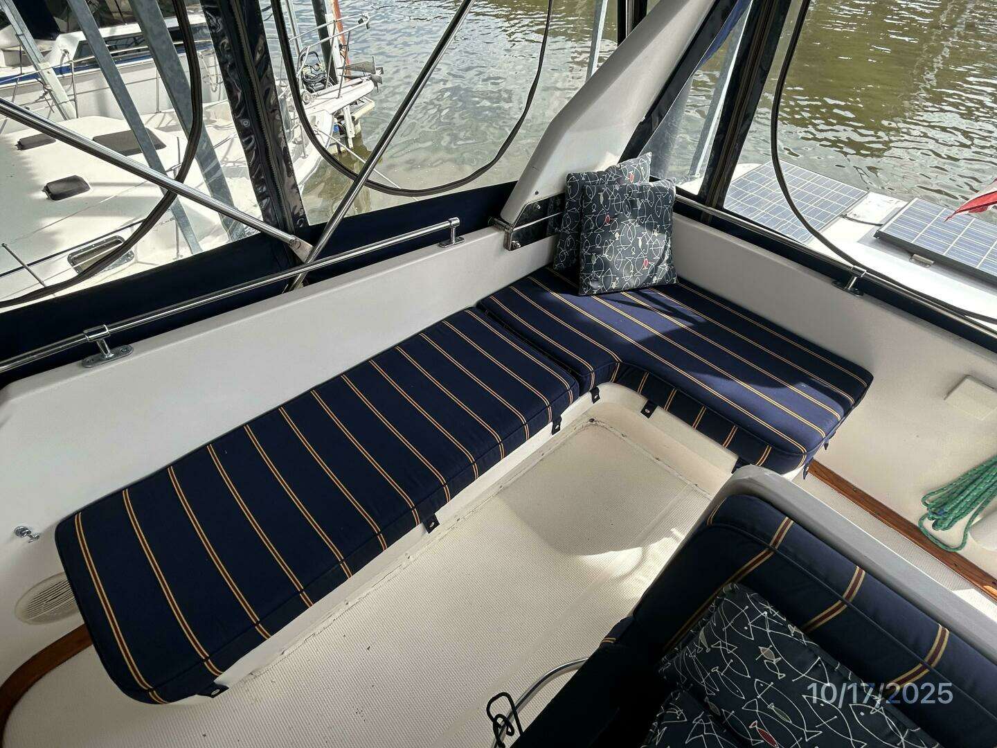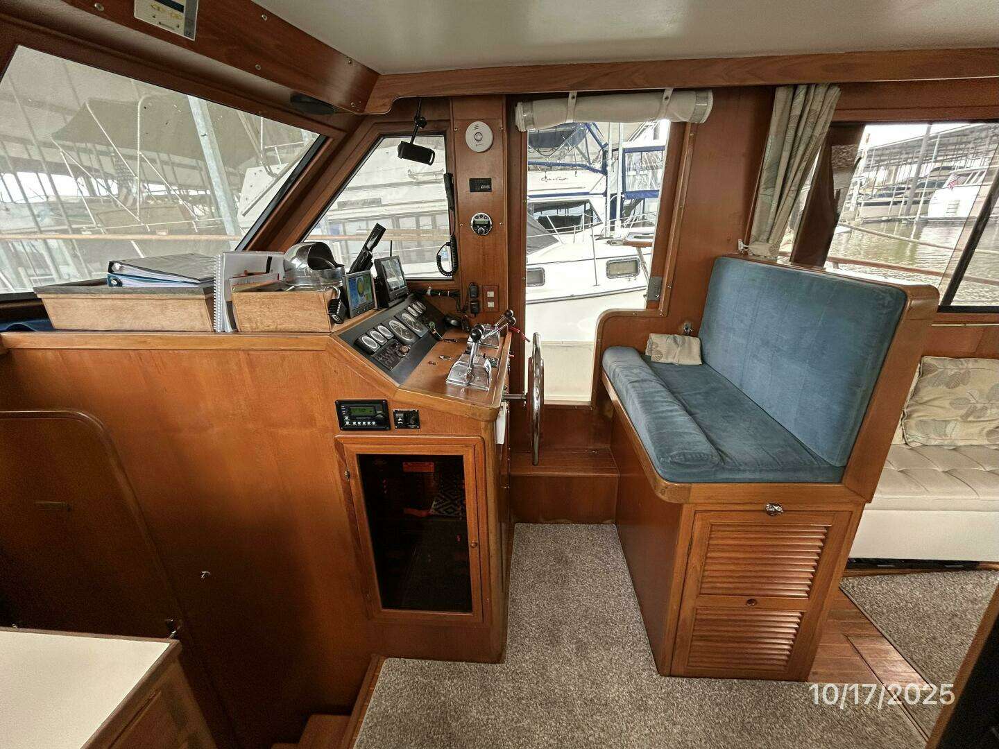 The flybridge offers a non-skid deck, bimini, Eisenglass enclosure, benchseat with storage on each side, helm benchseat, hinged Radar arch, hatch and stainless steel & teak ladder to the aftdeck, storage under the helm, Morse engine controls, anchor windlass control, VDO gauges and electronics and detailed in the electronics section of this presentation.