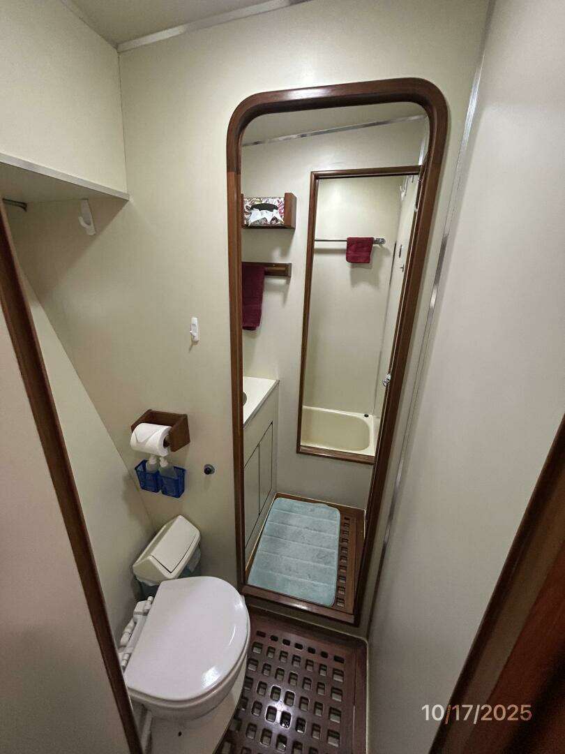 The guest stateroom is to port and offers a double size berth, hanging locker/cabinet, storage cabinet and drawers, shelf, book shelves, storage under the berth, reading light, fans, teak & holly sole and a privacy curtain. The head with a 1/2 tub/shower is to starboard and has access from the companionway.