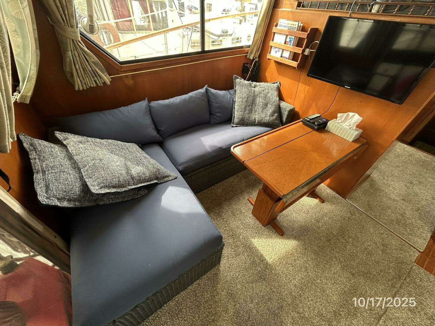 The salon offers a benchseat starboard aft, L-shaped seating with storage and a hi/lo folding teak table port aft, side deck access door starboard forward, screens on the doors, opening side windows with screens and curtains, aft windows, sliding teak & glass door aft, bound carpet over a teak & holly sole, book shelf and Samsung flat screen TV.