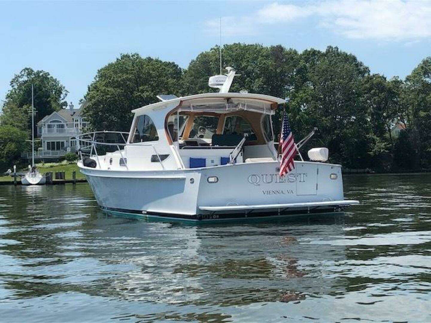 "Quest" has had exceptional owners that have taken great care of her. Her life started on the Chesapeake Bay and her previous owner moved her to Lake Champlain where she lived until the present owners bought her and trucked her back to the Chesapeake. she is hauled out every winter and anything needed is attended to. Low hours on her single Cummins 450HP dsl engine, Onan Generator, reverse cycle AC and HT, Bow thruster etc. Canvas cockpit Tanneau cover, canvas hardtop extension, Bridge deck enclosure helps extend her season.