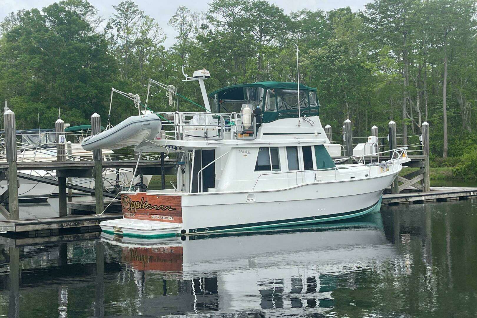 The Mainship 390 Trawler blends today's technology with years of experience in crafting thousands of trawlers. Inside the spacious cabin, for example, is a lower helm station that's complete with full instrumentation and a windshield equipped with wipers and washers. The salon features warm teak highlighted by designer fabrics, a color television and VCR, a stereo, and opening windows with screens. Deck access is made easy for shorthanded cruising with a starboard helm sliding door. There is also a large screened sliding door to the cockpit. The 390 Trawler's galley is equipped for cruising or entertaining with a range, a microwave, a full-size refrigerator, an oversize sink, abundant cabinets and Corian countertops. The large master stateroom has a center island bed, cedar-lined hanging lockers, an opening portlight and hatch, and again more storage. For guests, a second stateroom features twin berths along with a hanging locker, storage, an opening hatch and a portlight. And finally, the easy cleaning, molded fiberglass head offers a built-in vanity, a shower, an electric marine toilet, an opening hatch, a portlight and a mirror.