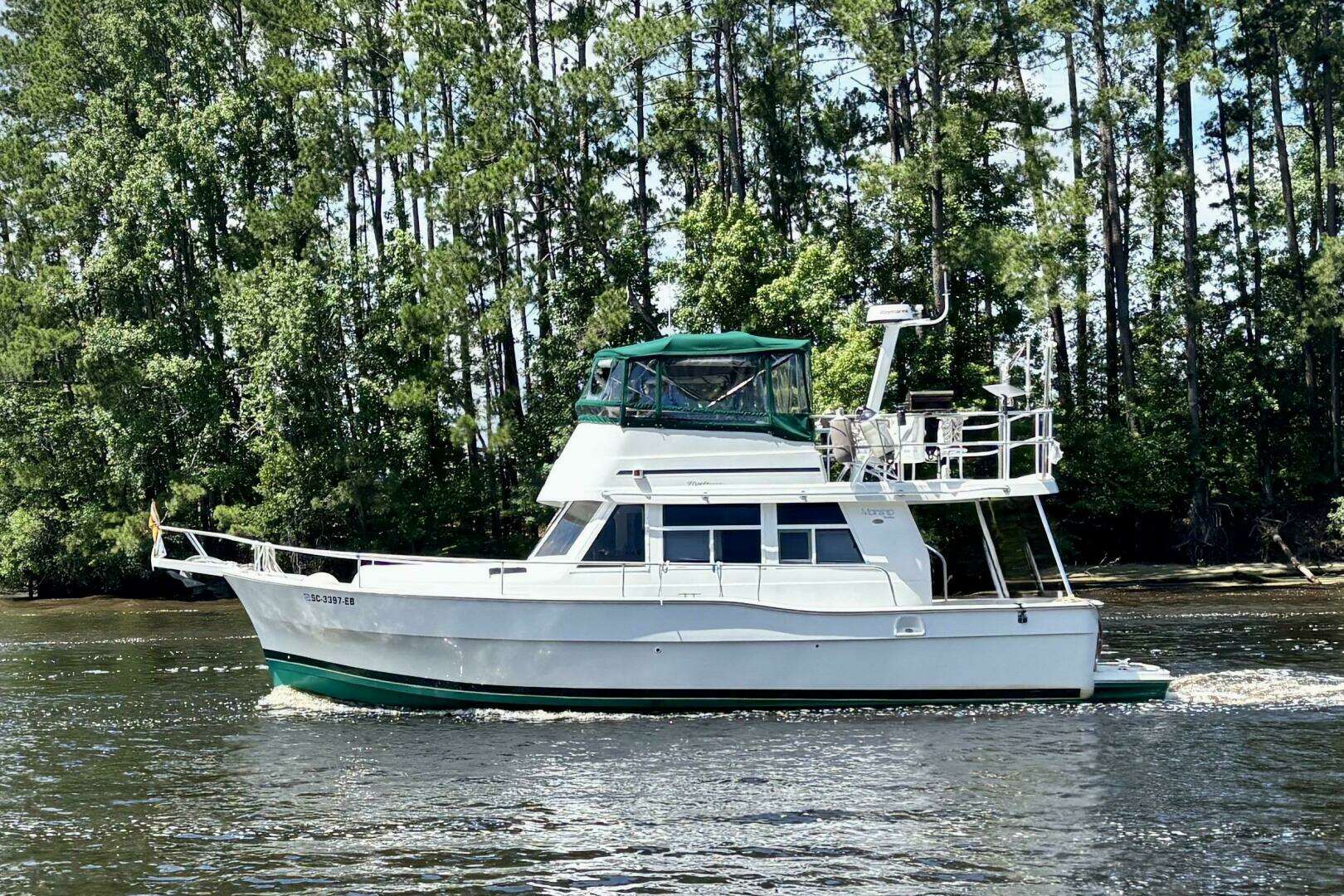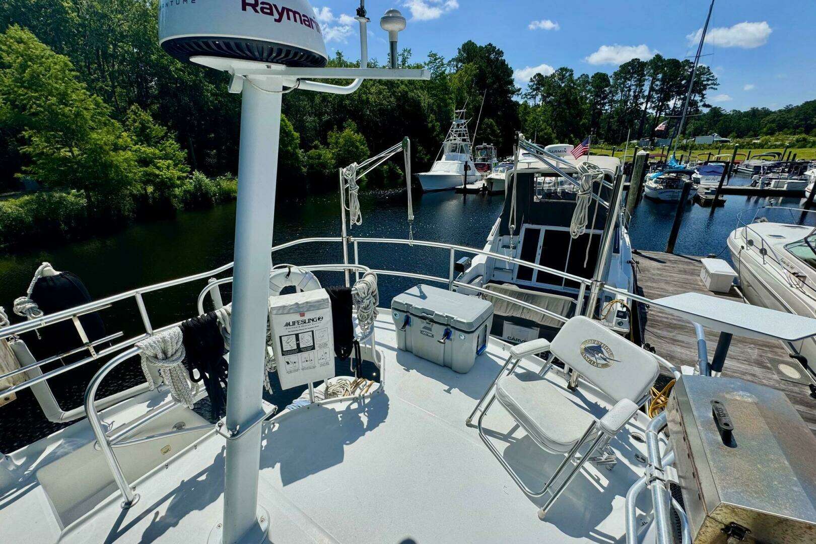 The power to travel is provided by a standard single Caterpillar diesel. To make docking easier, a bow thruster is included. On the flybridge there is a large area for entertaining or lounging, seating for more than six, and a drop-leaf table. The center helm has great visibility, full instrumentation and plenty of room for electronics (note the radar mast). This deck is reached by a wide, molded stairway with a full handrail. Access forward to the anchor is protected by a high bulwark and a walk-around deck. In the cockpit there is more than ample storage with deep wells and a lazarette.