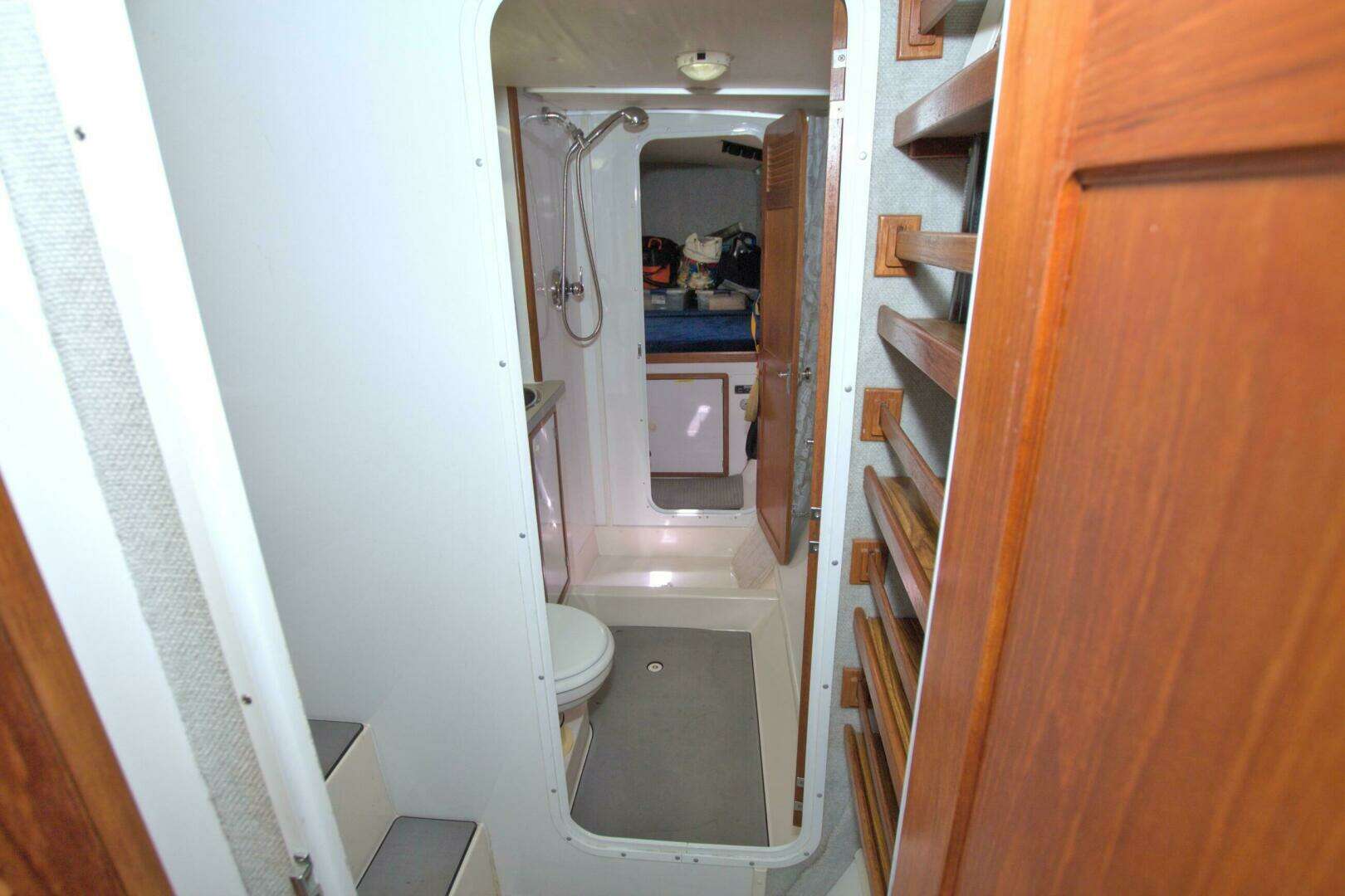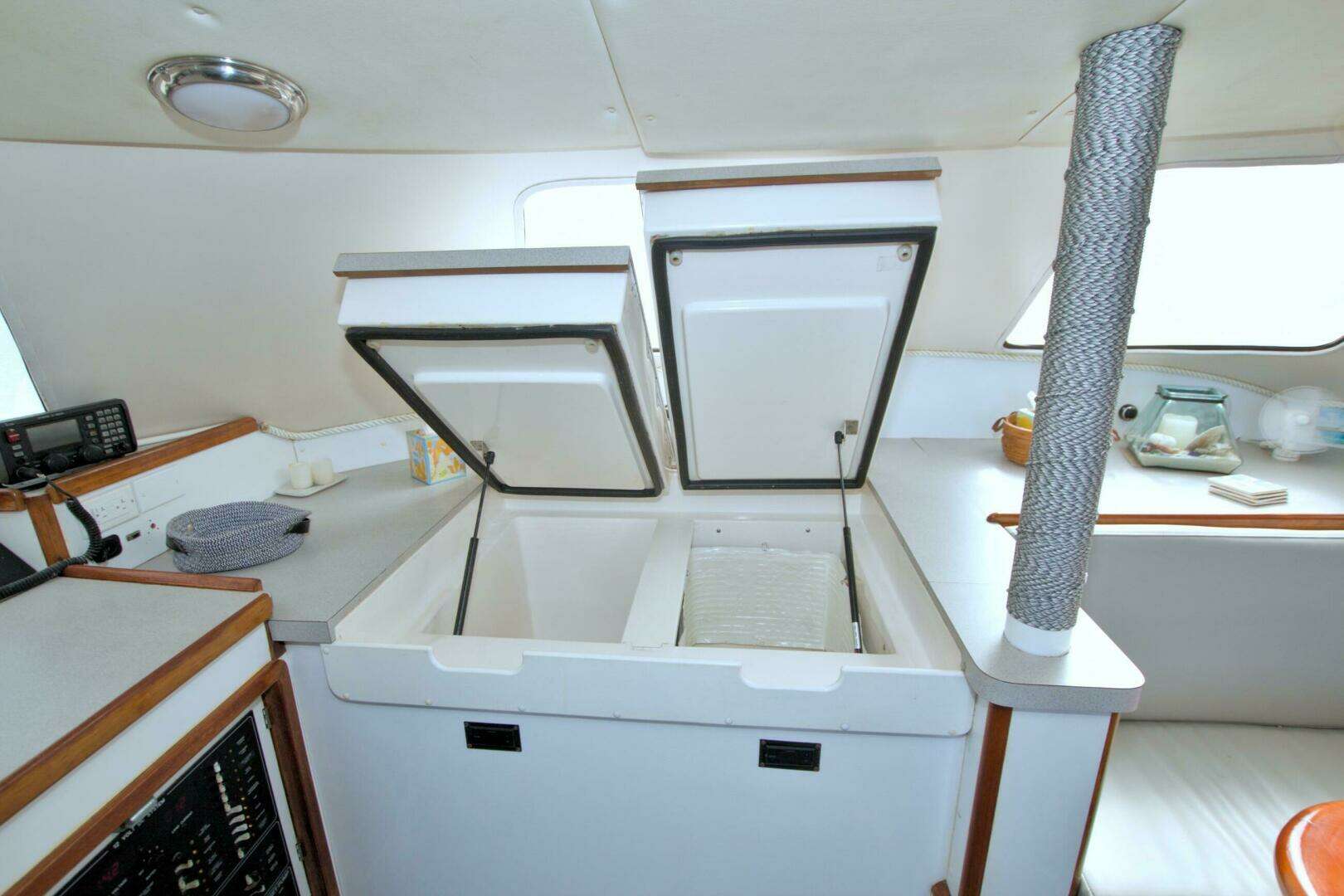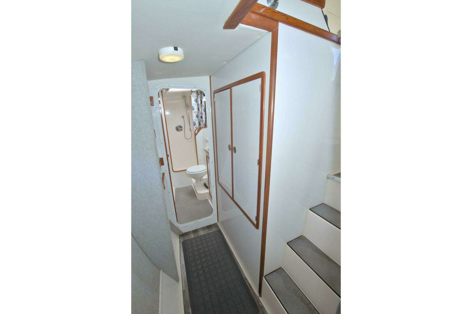 Entry into the salon is through a true "sea hatch" slightly to starboard of the centerline. To starboard forward is a large L-shaped settee with a beautiful varnisned adjustable table. To port forward is the refrigerator/freezer area, which may be the best in the business. The amount of insulation creates a large refer section and very accomodating freezer. Along the port side salon is the chart table with storage below. Aft to port in the U-shaped galley with double sinks, propane stove with oven and a microwave oven. A large hanging locker is along the starboard aft bulkhead with a 32' flat screen tv mounted on the bulkhead. Down four step to port you enter the master suite. It offers a full queen berth aft and a great head with a huge shower forward. The starboard hull has a large single berth forward and a full queen aft. Between the cabins is a head with marine toilrt, sink and counter and a shower. Hull sides are covered in grey Ozite carpet. Cabinetry is white laminate with teak trim and laminate counter tops. Headliners and sole are vinyl. Boat has two zones of reverse cycle heat and air conditioning.