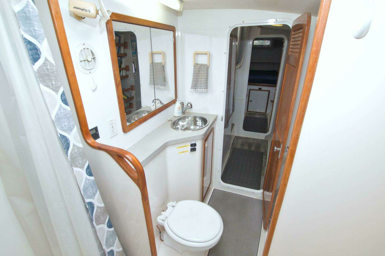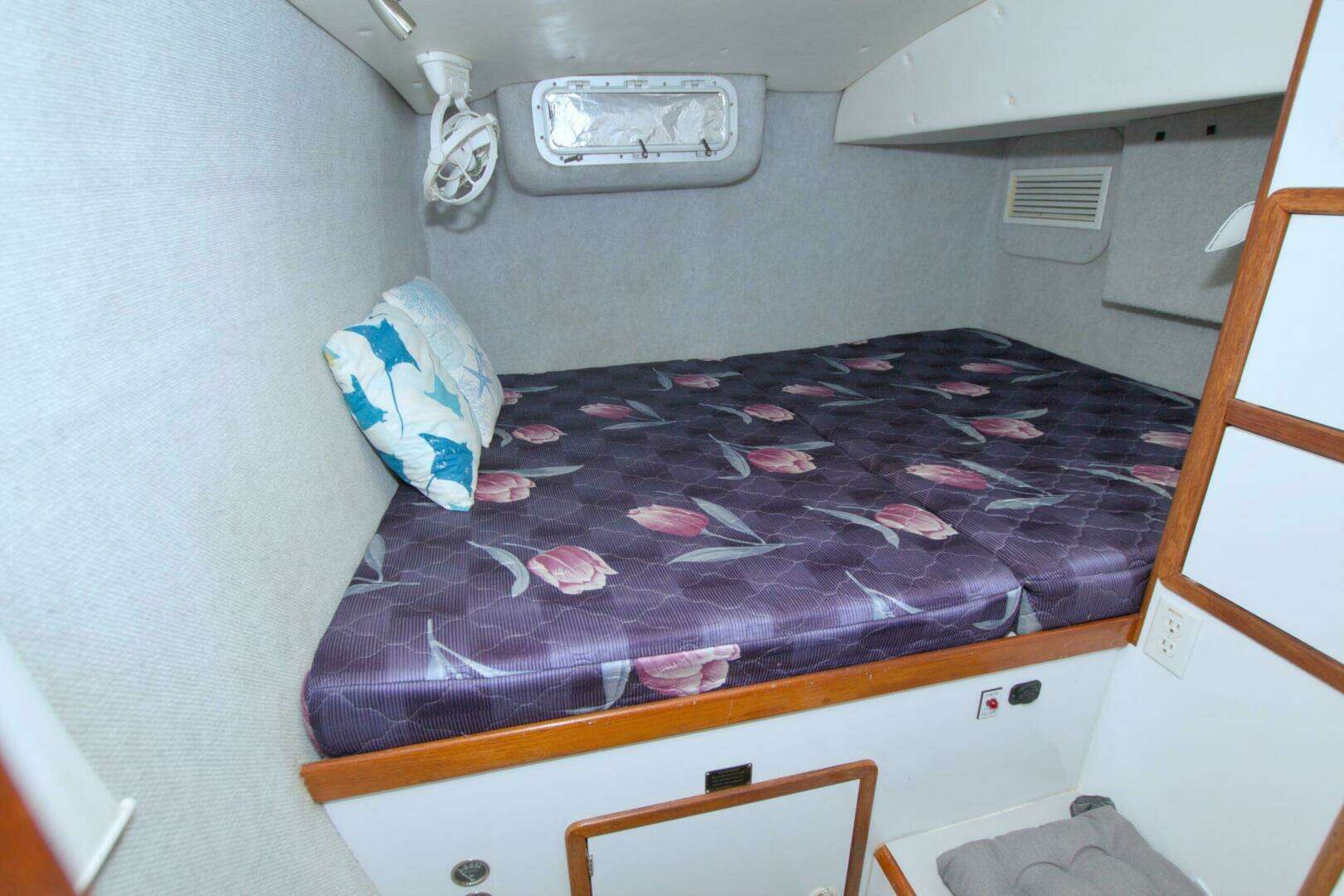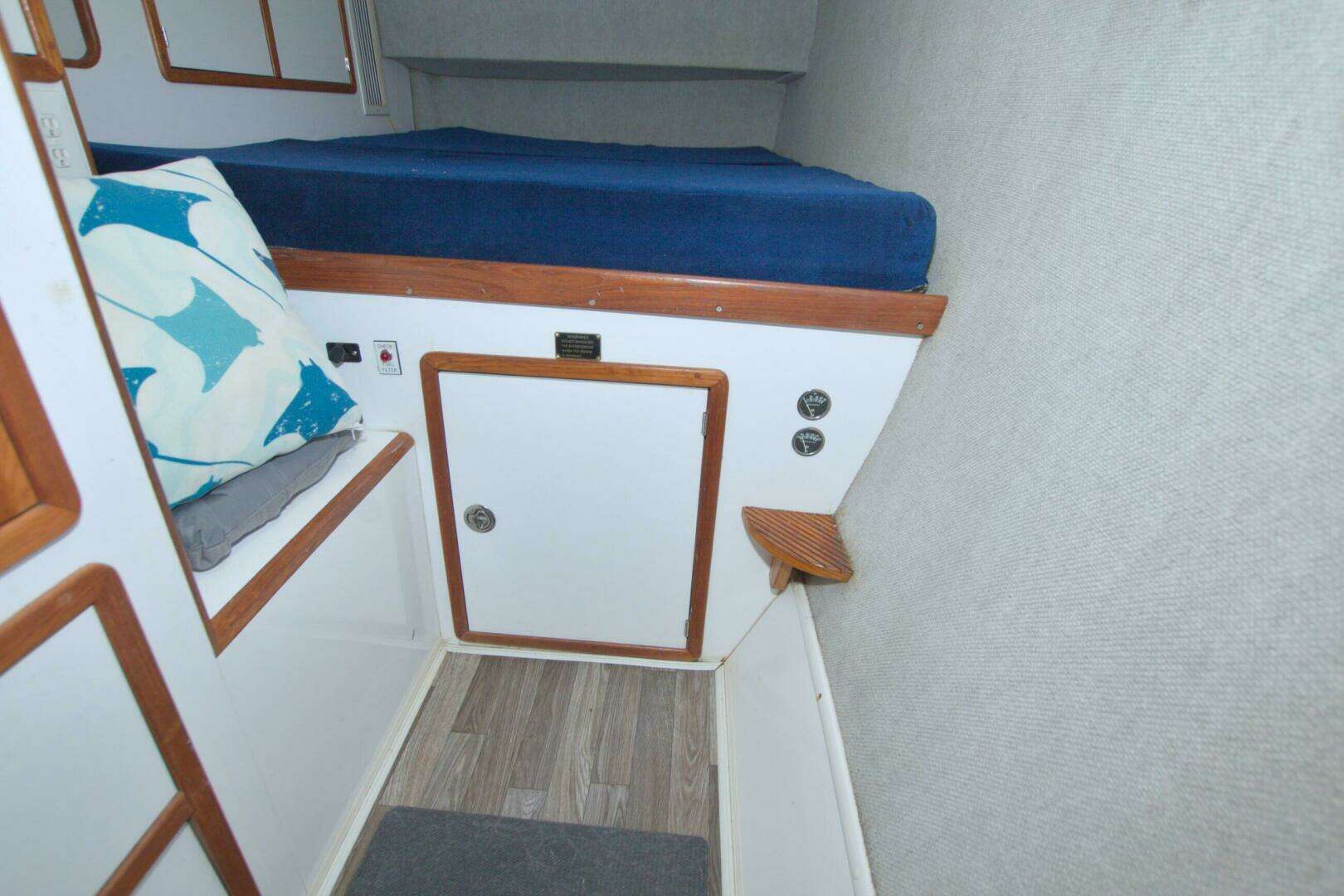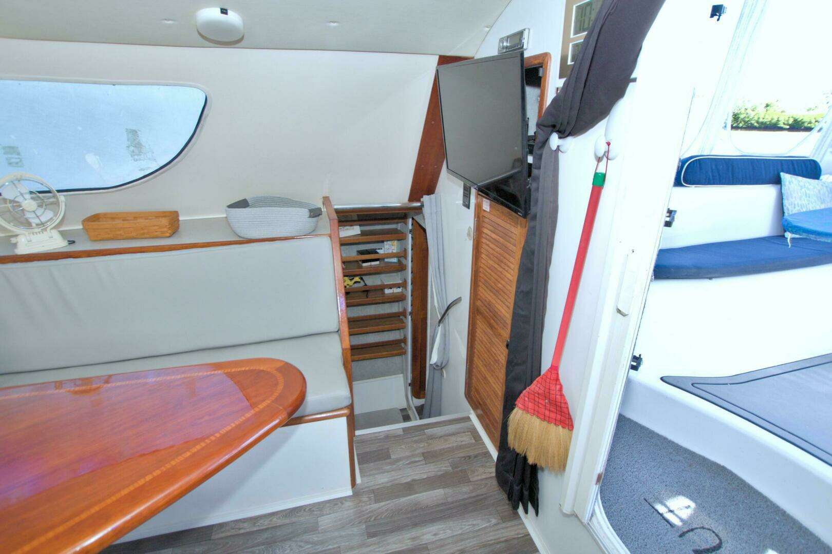 Entry into the salon is through a true "sea hatch" slightly to starboard of the centerline. To starboard forward is a large L-shaped settee with a beautiful varnisned adjustable table. To port forward is the refrigerator/freezer area, which may be the best in the business. The amount of insulation creates a large refer section and very accomodating freezer. Along the port side salon is the chart table with storage below. Aft to port in the U-shaped galley with double sinks, propane stove with oven and a microwave oven. A large hanging locker is along the starboard aft bulkhead with a 32' flat screen tv mounted on the bulkhead. Down four step to port you enter the master suite. It offers a full queen berth aft and a great head with a huge shower forward. The starboard hull has a large single berth forward and a full queen aft. Between the cabins is a head with marine toilrt, sink and counter and a shower. Hull sides are covered in grey Ozite carpet. Cabinetry is white laminate with teak trim and laminate counter tops. Headliners and sole are vinyl. Boat has two zones of reverse cycle heat and air conditioning.