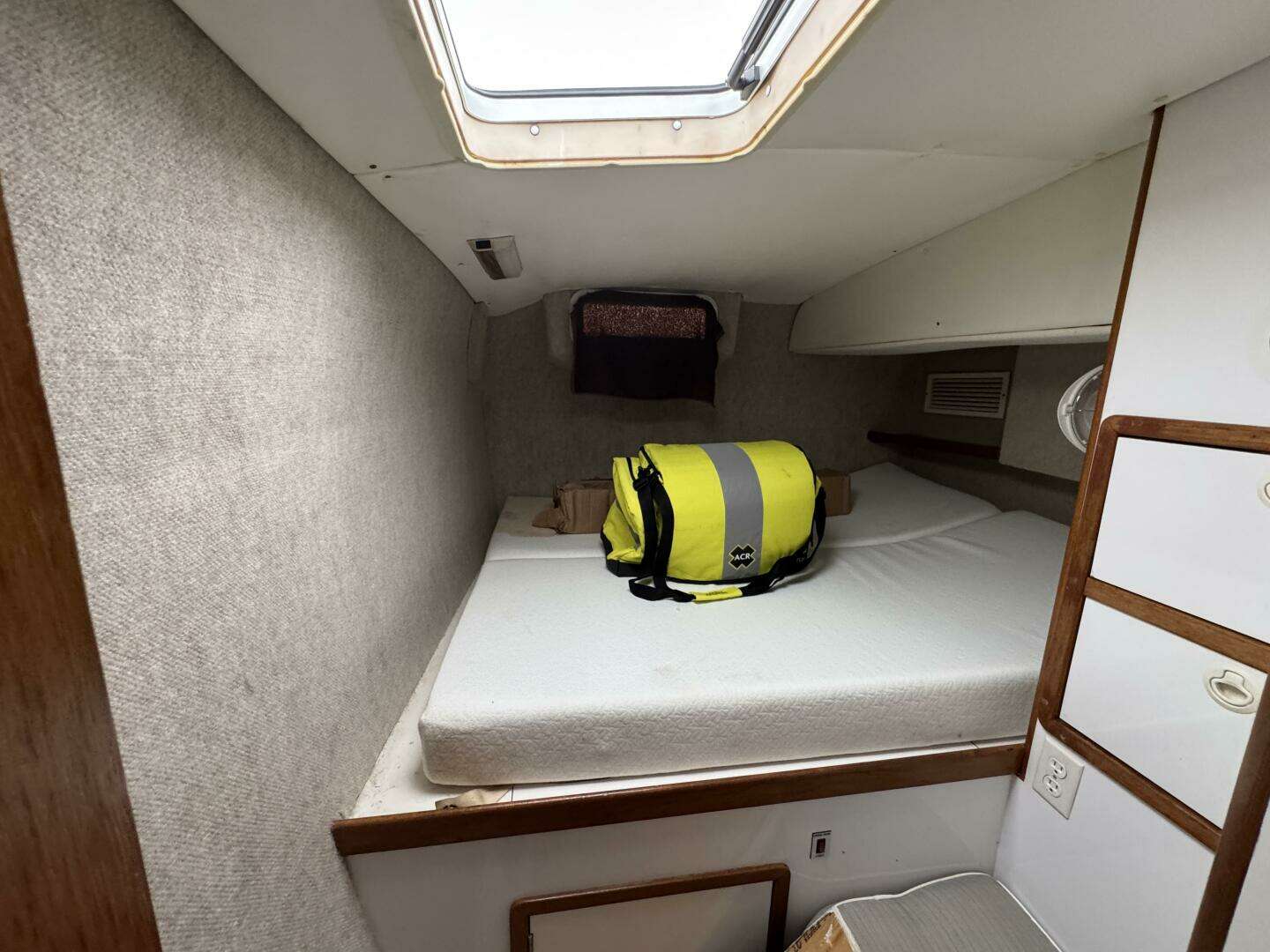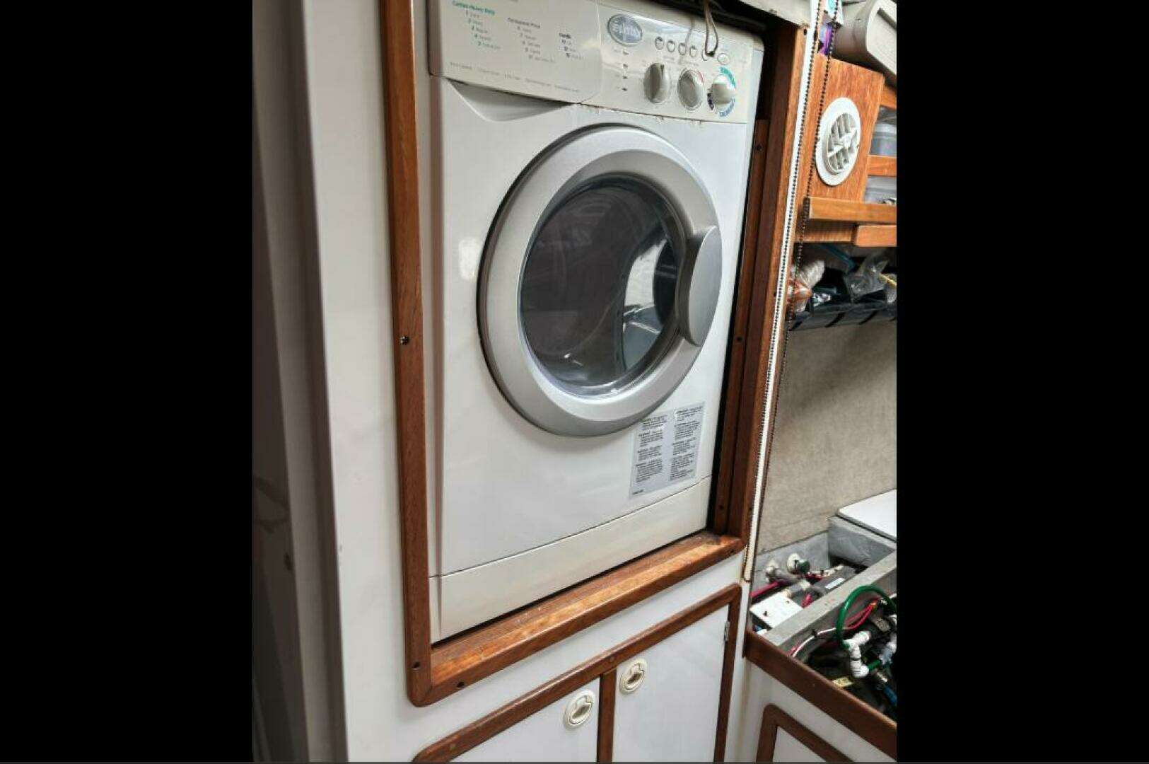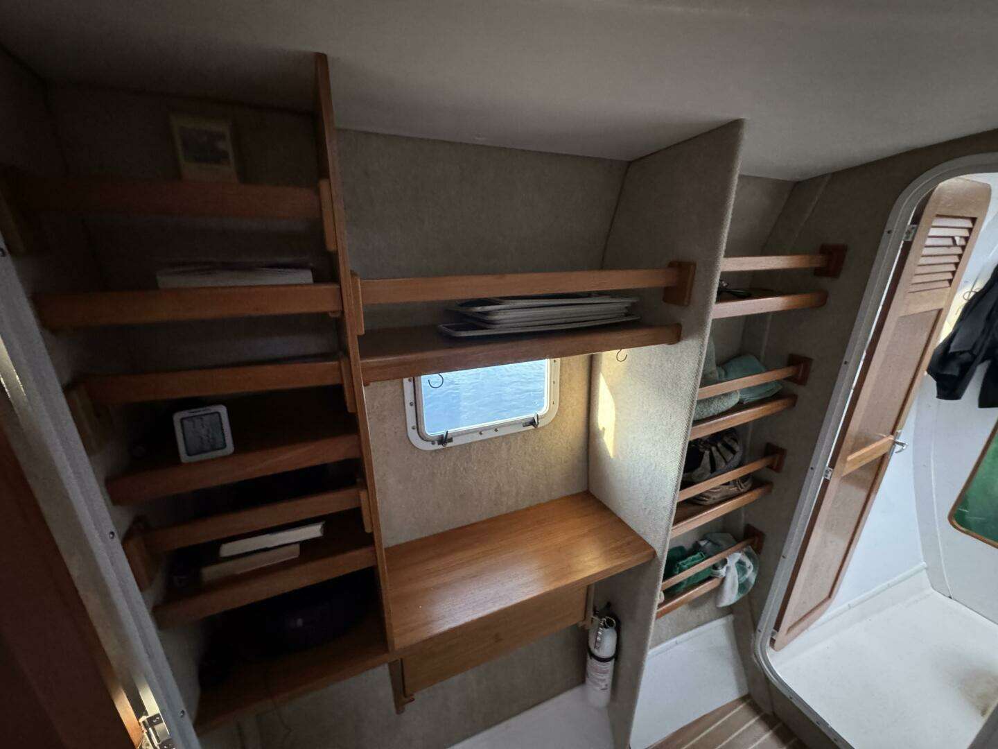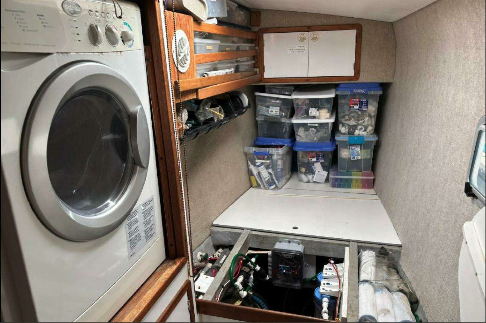 Forward Guest Stateroom/Machinery Room• Single size• Splendide washer/dryer with outside venting (upgraded 2019)• Closed storage cabinet forward• Custom teak storage shelves inboard• Closed storage cabinet under washer• Machinery space under berth with water-maker, water heater, raw water manifold servicing water maker and air conditioners• 12v DC Fan