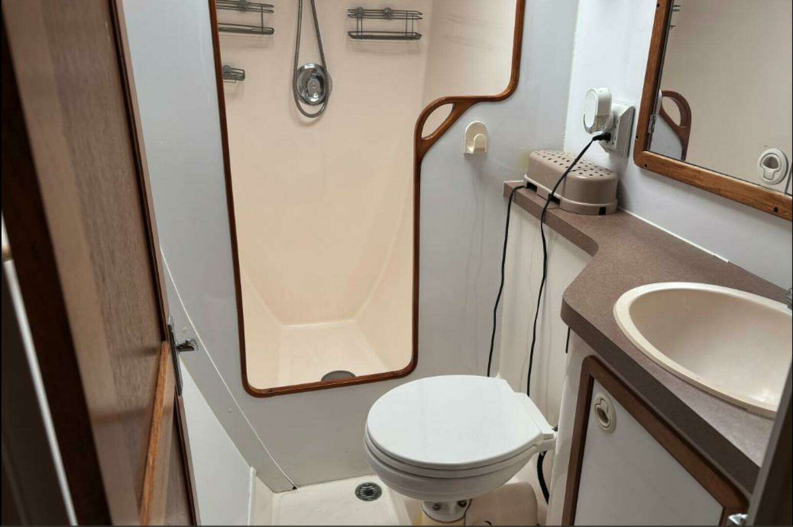 Guest HeadThe Guest Head is midship and can be accessed by both Guest Staterooms• Jabsco fresh water Quiet Flush electric toilet• Vanity with countertop, sink and storage below• Large medicine chest.• Storage area inset.• Separate stand up shower area.• 12v DC Fan.