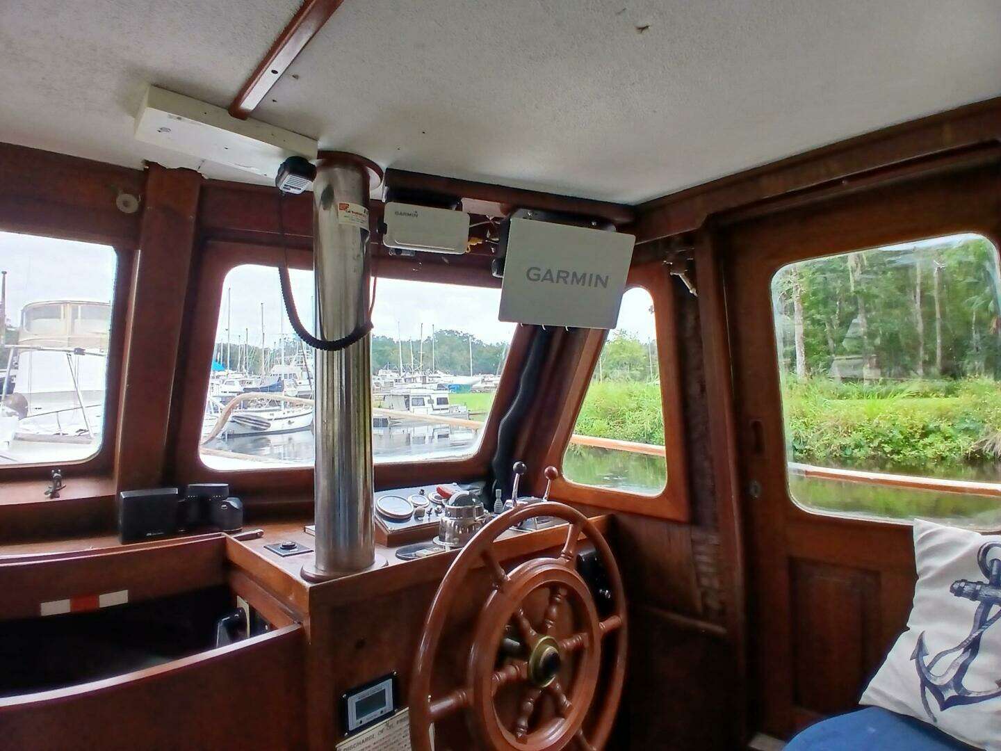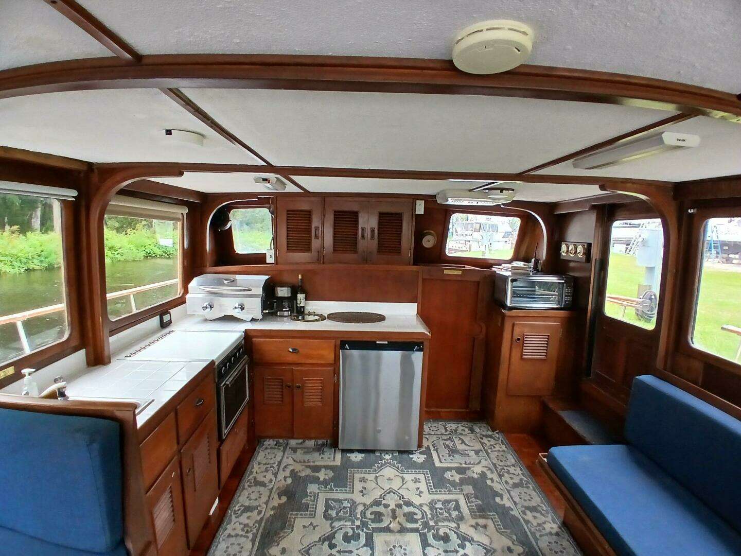 Marine Trader Trawlers have been loved in the cruising trawler community ever since they first came to the market. Their luxuriously spacious interiors are beautifully designed, with aesthetics and comfort in mind. Marrilee, a 1979 40 ft Double Cabin, is a fine example of this, with an incredible amount of space and storage. Her main cabin serves as a pilot house, galley, and salon. The spacious wood interior is calming and warm, with many large windows to let in the light. A comfortable settee is to port, and the galley on the starboard side has it all, storage, counter space, and a brand-new stainless-steel convection/microwave oven. Forward of the galley, the interior helm station has many upgraded features and incredible visibility.