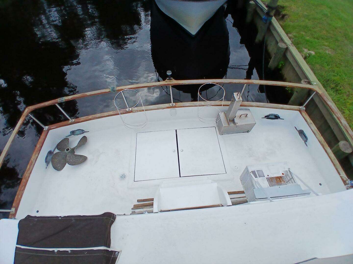 The exterior features a spacious top deck with multiple seating options and a full helm station as well. The side decks are wide and accommodating, with Teak guard rails for safety and style. This teak is in overall good condition but needs some varnish!
