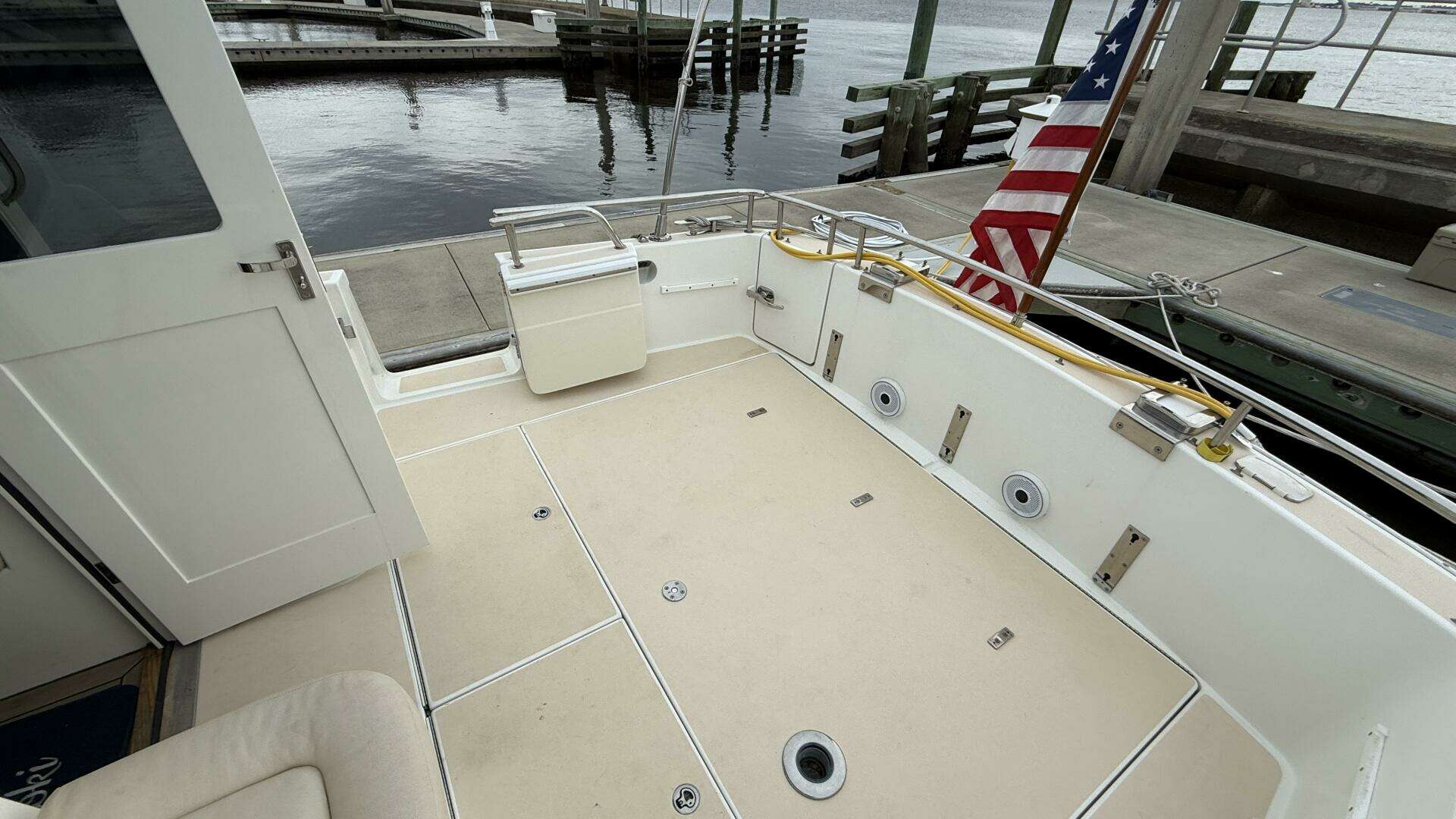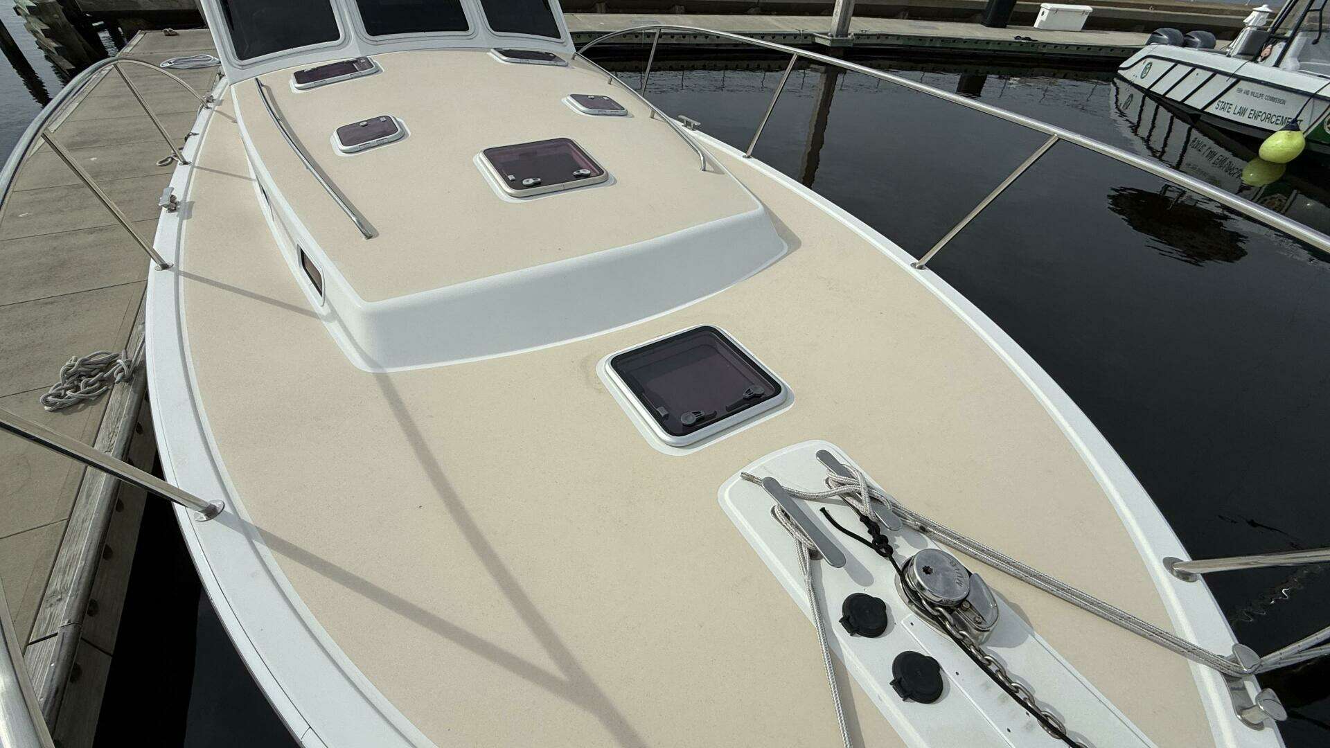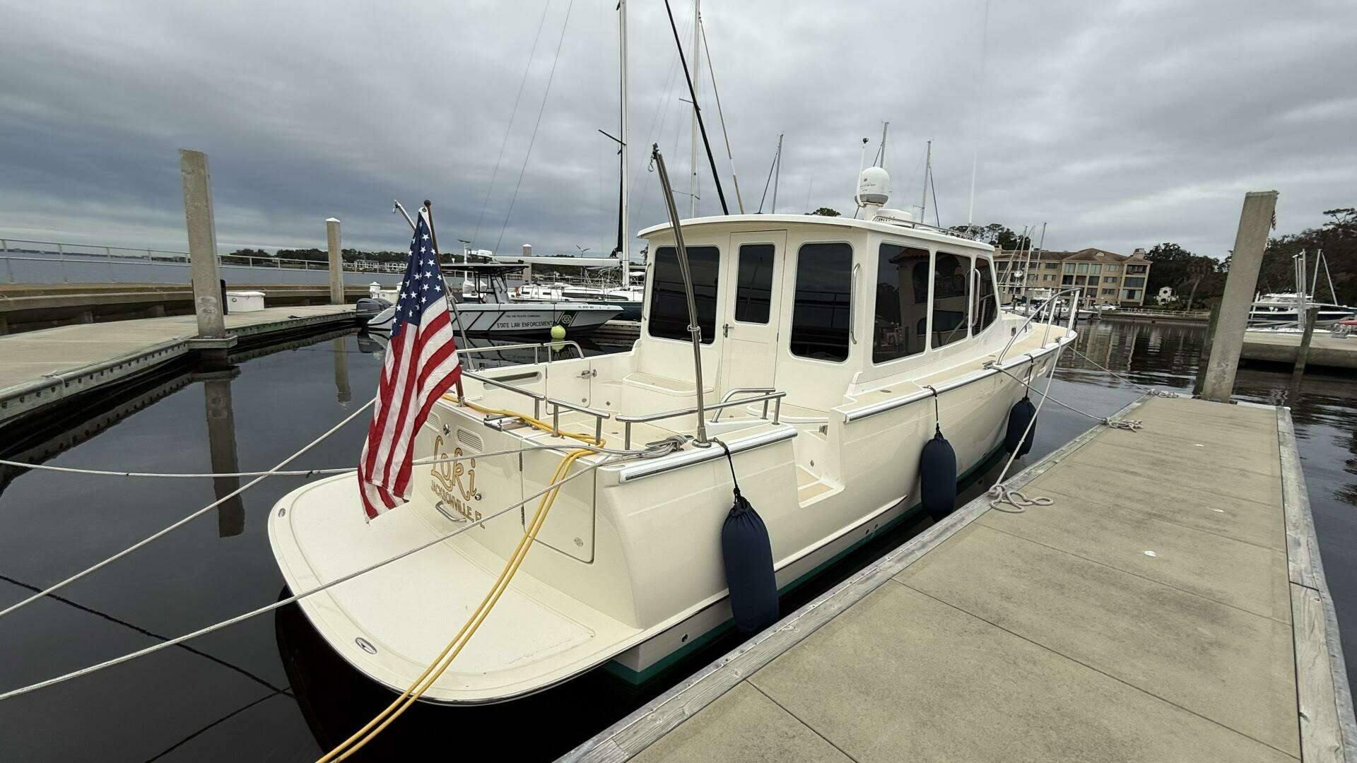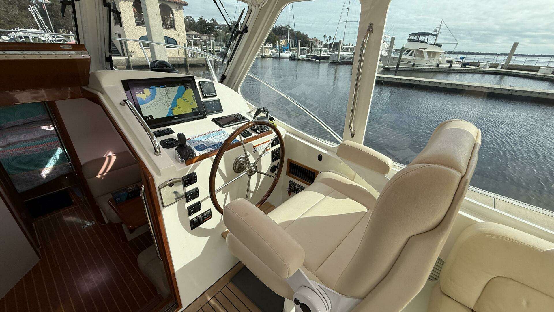 A truly one-of-a-kind MJM 40z, Loki has benefitted from her current owners desires to make her a great couples cruiser up and down the coast. To provide better protection from the Florida sun or rain, the current owners had a full 'hard sided enclosure' built for the pilothouse at Huckin's Yacht Yard, and painted the hull a beige Awlgrip color to reduce the amount of solar gain from the hull.