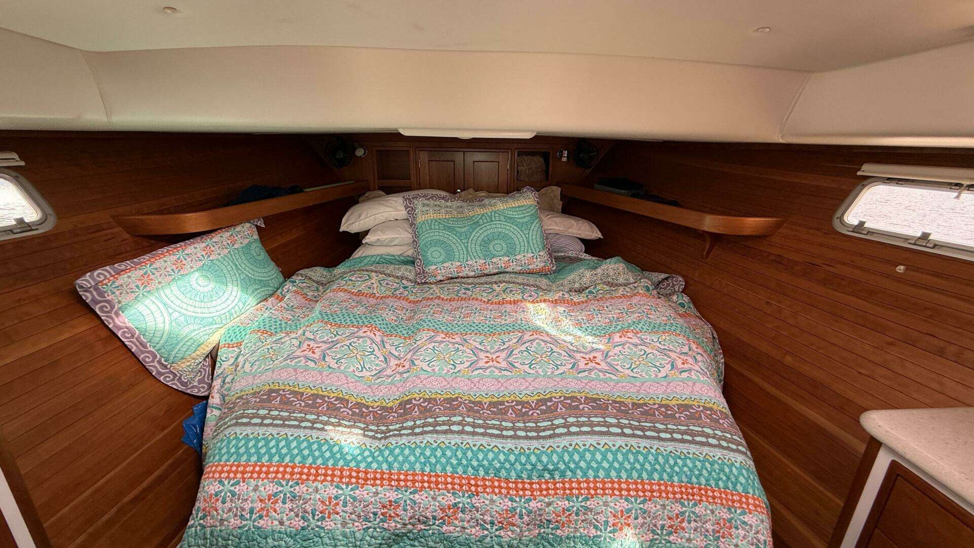 The owners' stateroom is forward and features a large (60" x 78") island berth with side access. There are four drawers at the end of the berth and a large storage area underneath. A hanging locker is to port. Book shelves and reading lights are at the head of the berth. Two overhead hatches provide star-gazing and ventilation. Hatches and ports all have ocean air, retractable shades, and screens. Access to the head and separate stall shower is from this stateroom. The queen berth has a latex mattress with custom fitted sheets, designer bedspread, pillows and towels.