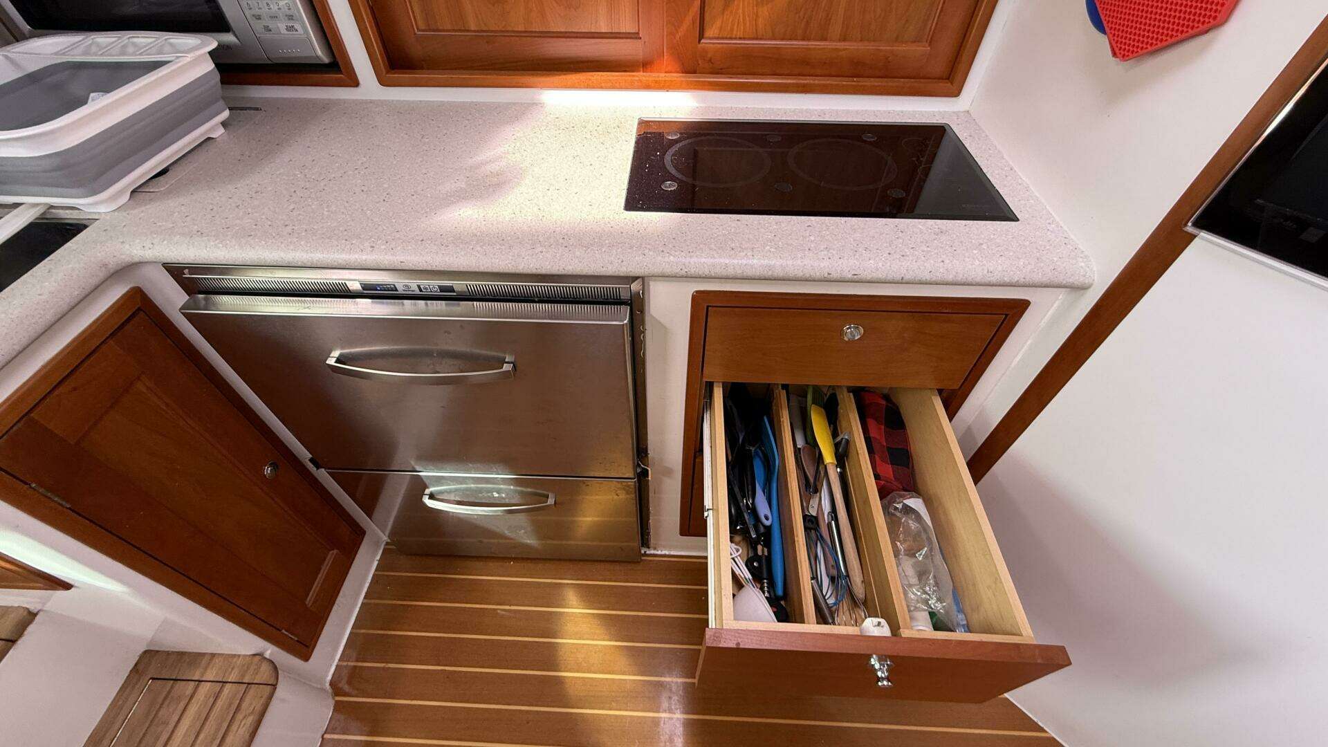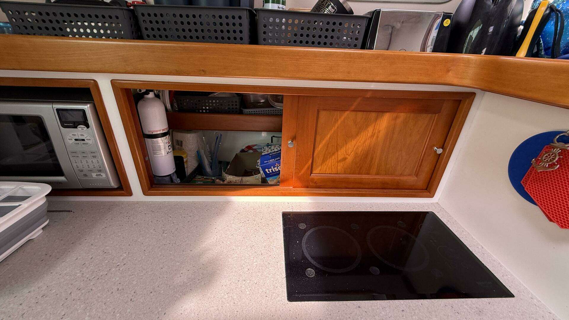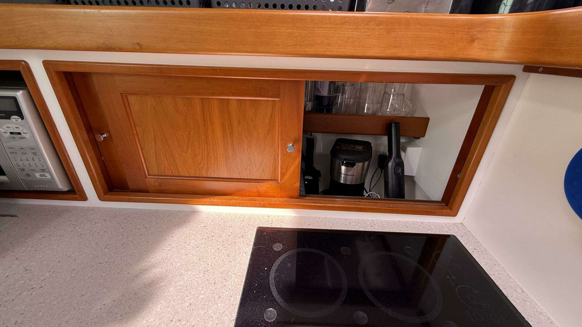 The galley is opposite the dinette with Corian counters, cherry paneled cabinetry, and push button hardware. Plenty of storage in lockers and drawers. Stainless Isotherm 5.5 cubic foot two-drawer refrigerator/freezer. Ceramic two-burner electric stove with pop-up retainers; Convection/ microwave oven.