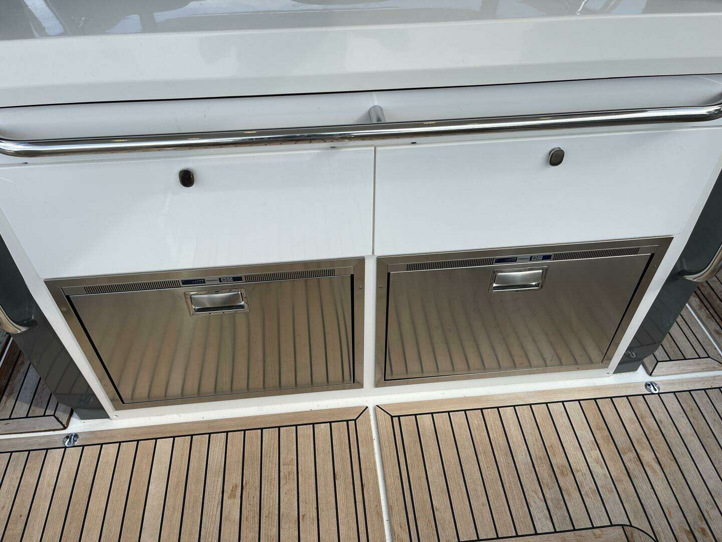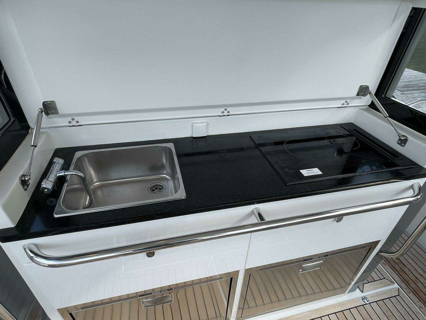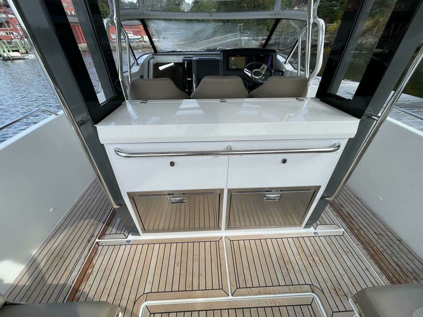 The lounge area has three sofas and a large table which, depending on its position, can function as a sun deck or a seating area that can either have all seats facing the direction of travel or alternatively facing one another. The outdoor kitchen has drawers for cutlery and tableware, a kitchen sink with hot water and space for a gas stove or electric grill. The large storage space measures just over 2500 liters and boasts a hydraulic opening mechanism that is easily accessible from the after-deck. It has space for everything you could ever want to bring with you, whether that be SUPs, sea bobs, wakeboards and biscuits or simply an inflatable rubber boat. The bathing platform and the after-deck are ample and easily provide enough space for several people at the same time.