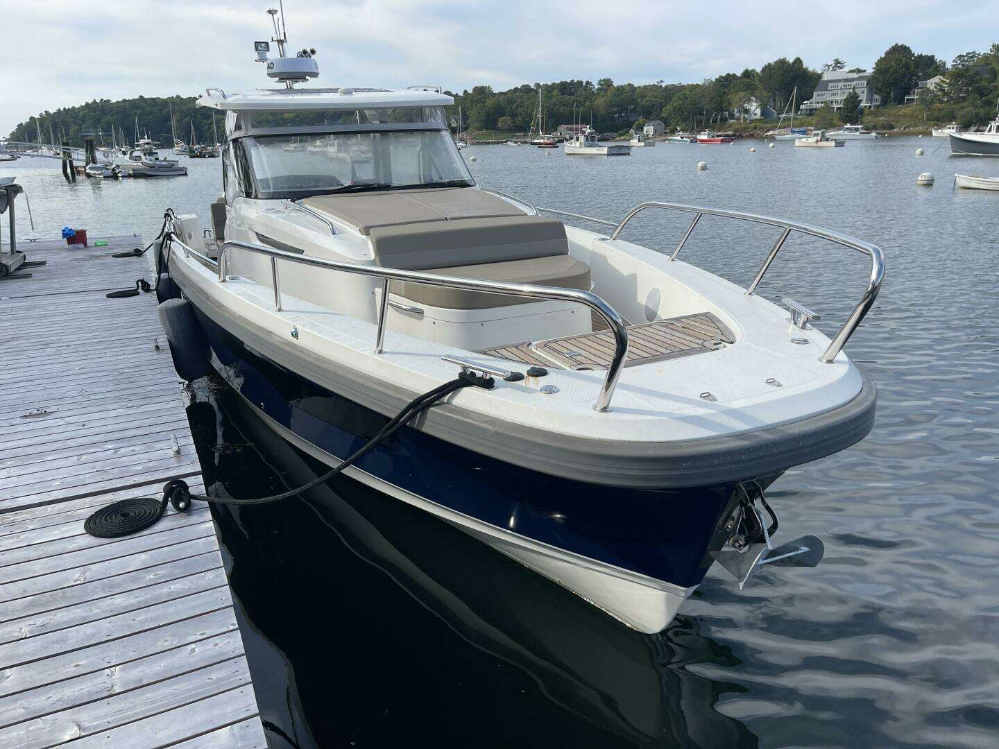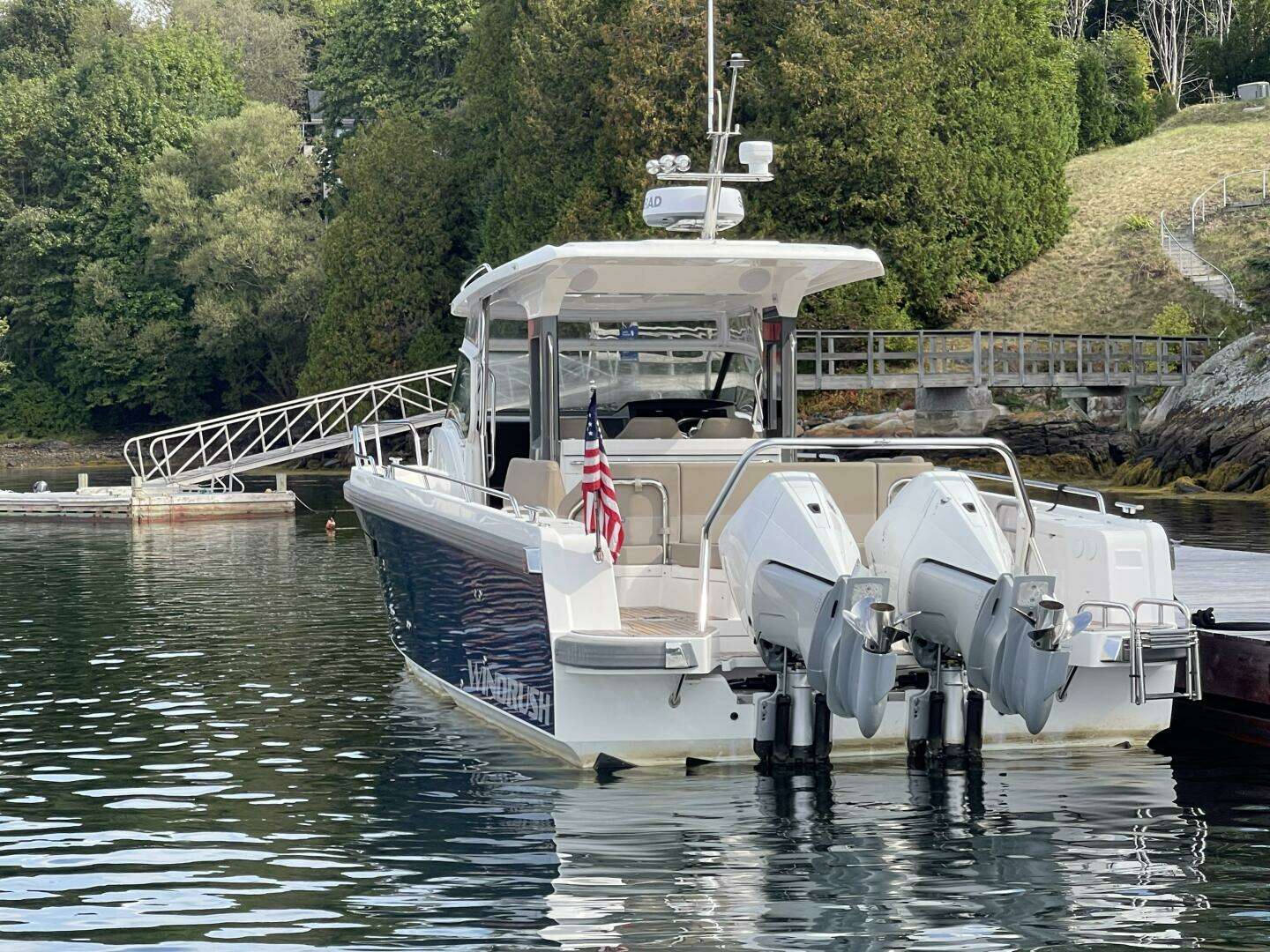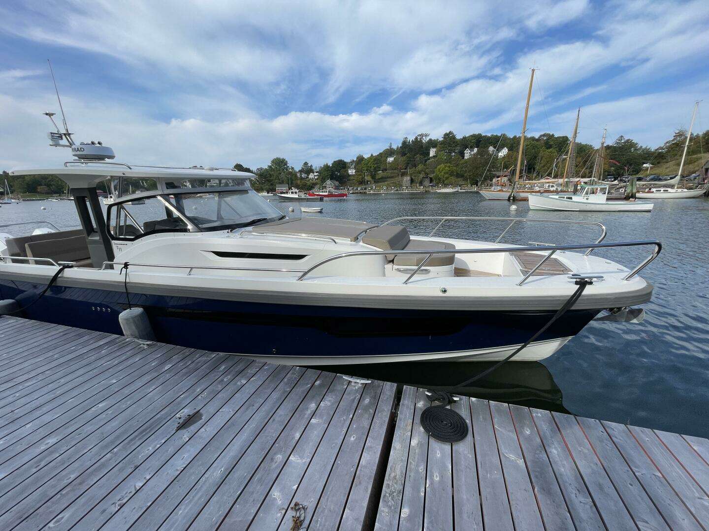 Introducing the Nimbus T11, a stunning 40-foot center console boat from 2021, known as WINDRUSH. This used vessel boasts a sleek fiberglass hull, ensuring durability and performance on the water. Powered by twin Mercury 300 XXL CW outboard engines, equipped with joystick control, it delivers an exhilarating cruising speed of 30 knots and a maximum hull speed of 40 knots, perfect for thrilling adventures. The T11 is designed for comfort and convenience, featuring an electric windlass for effortless anchoring. With a well-appointed head, it provides essential amenities for day trips or longer excursions. This boat's thoughtful design and powerful performance make it an ideal choice for both leisure and sport, promising unforgettable experiences on the water. Whether you're fishing, cruising, or entertaining, the Nimbus T11 is ready to elevate your boating lifestyle.