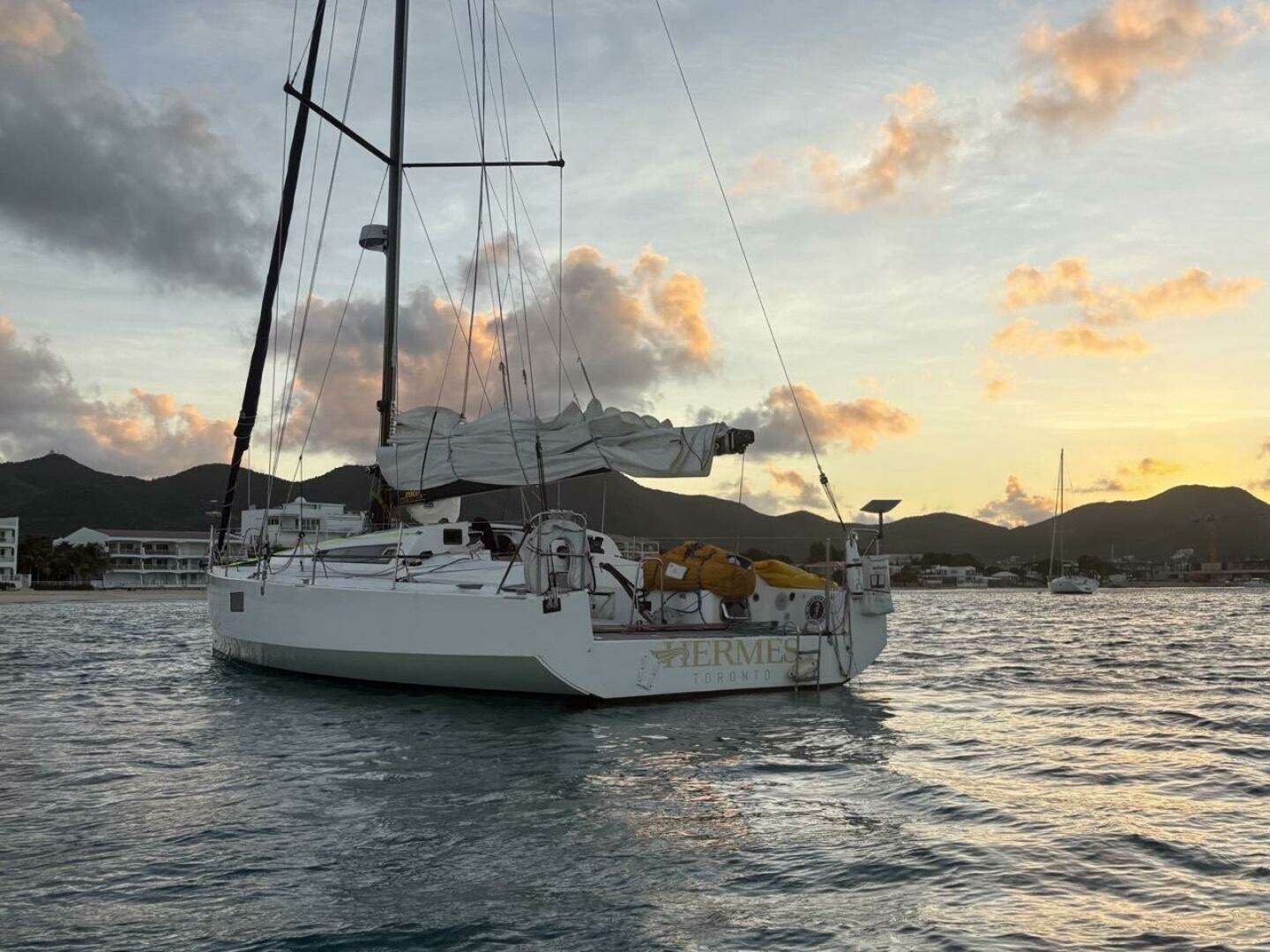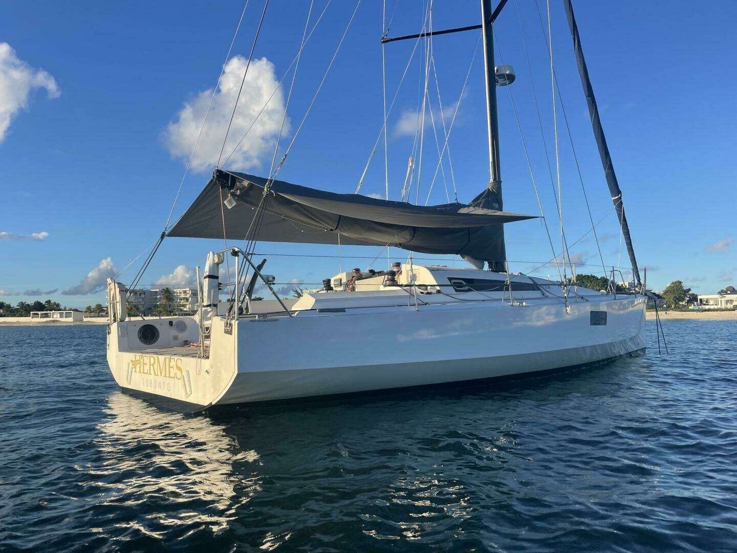 Notable deck equipment includes racing-grade running rigging, carbon mast with swept spreaders and square-top mainsail capability, multiple sail inventories for varied conditions, and offshore safety gear rigged for quick deployment. Ocean Racers operated this yacht as Hermes for race charter and offshore campaigns, participating in Caribbean events and training programs, reflecting her readiness for performance sailing.