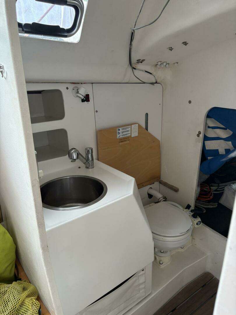 Below, the interior is functional and well-lit, optimized for offshore comfort and utility. A central saloon with sturdy table and comfortable settees provides communal space. The galley is equipped with secure storage, refrigeration, and provisions for extended cruising. Forward and aft cabins offer sleeping accommodations, with practical storage throughout. A dedicated technical/utility space and enclosed head with shower enhance liveaboard usability. Systems include pressurized water, navigation electronics, and integrated electrical distribution suitable for offshore voyaging.