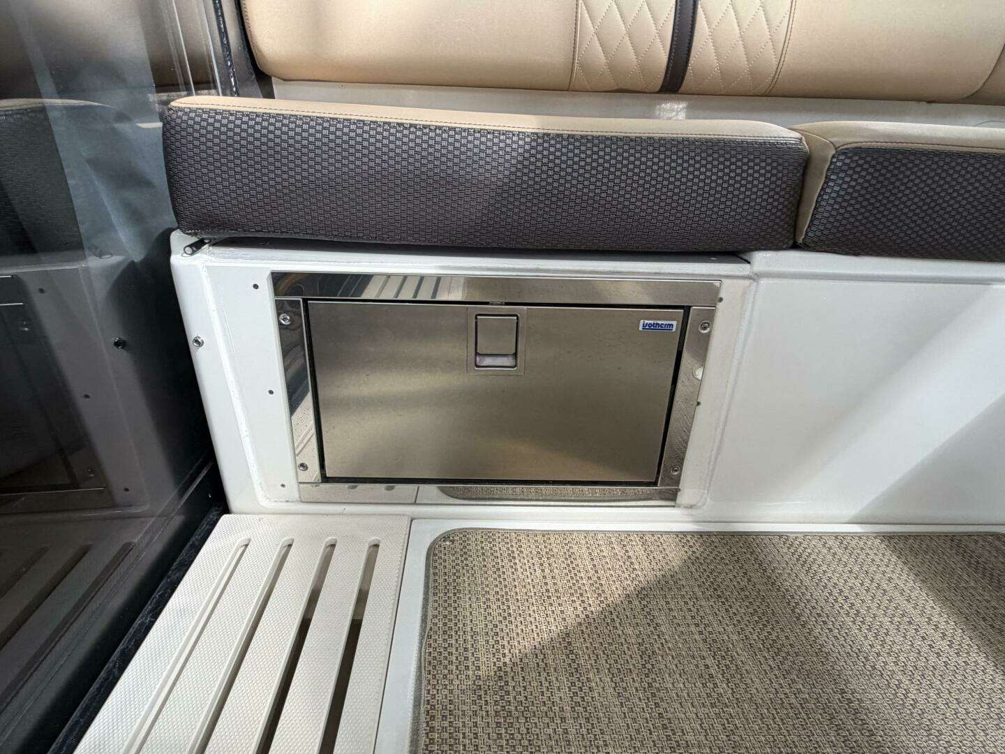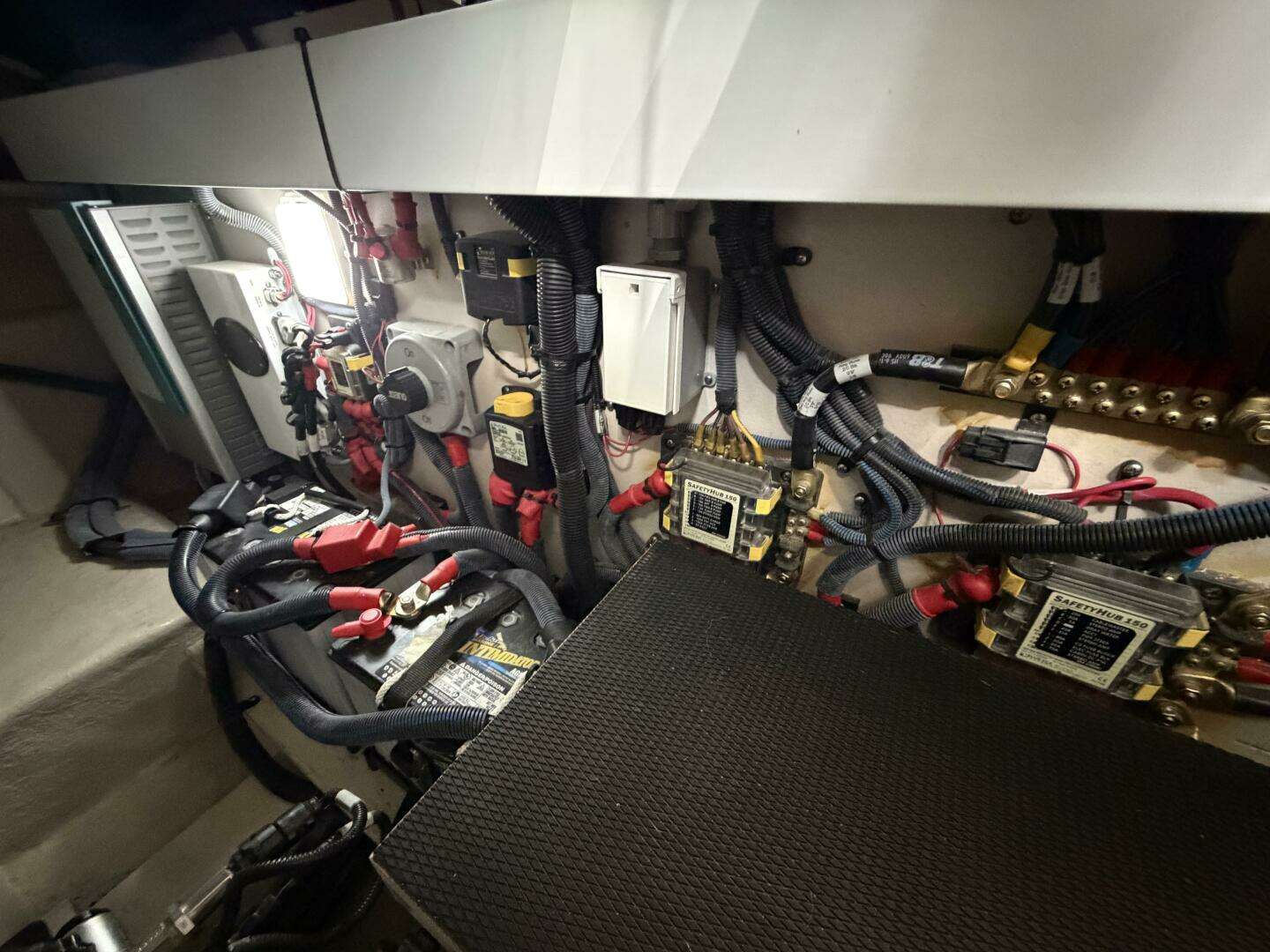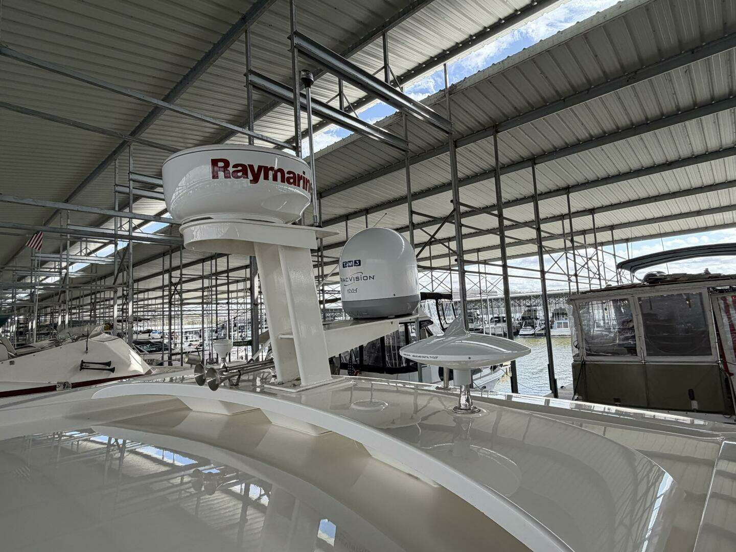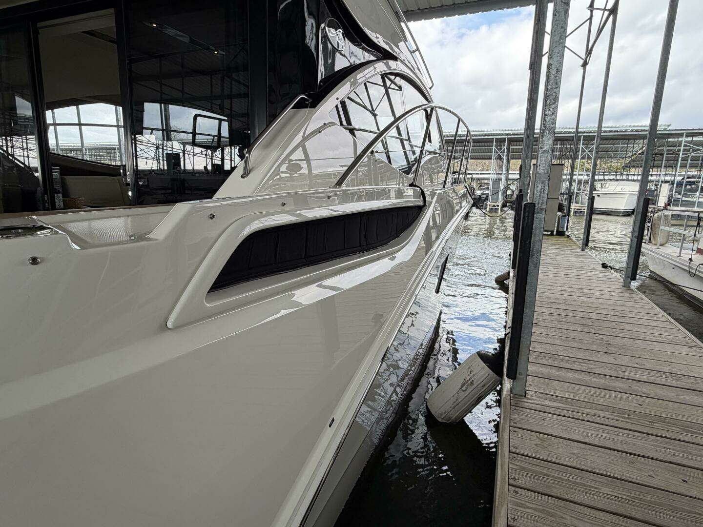It’s a white hull with black canvas, Aft Isinglass Enclosure, Inverter System, Foredeck Audio, Windlass with SS anchor, Hydraulic Swim Platform, Electric Cockpit Awning, Mesh Windshield Shades, Custom Cockpit Refrigerator, Teak Cockpit Table, Bow Thruster, Inboard Joystick Docking System, Interior Stereo Upgrade, Dynamic Running Surface, Cockpit Cool Box, Underwater Lights, DSS Satellite System, Oil Change System, Fuel Transfer Pump, Factory Storage Cabinet in Aft Stateroom, Single Head Layout, TV’s in both Staterooms & Salon, Twin Raymarine Radar/Chart Screens, and U.S. Flag & SS base.