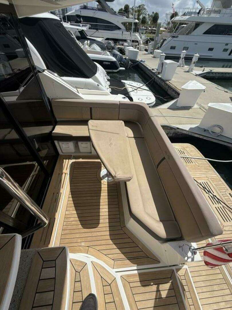 Upon approaching the vessel you will first notice the sporty styling and large teak laid swim platform. The swim platform is the perfect spot for enjoying the sun, diving off the stern, or grilling your favorite meal on the transom mounted electric grill. As you pass through the transom opening into the cockpit you find a l shaped seating area with a teak table. The perfect spot to supervise little ones as they play off of the stern of the anchored vessel.