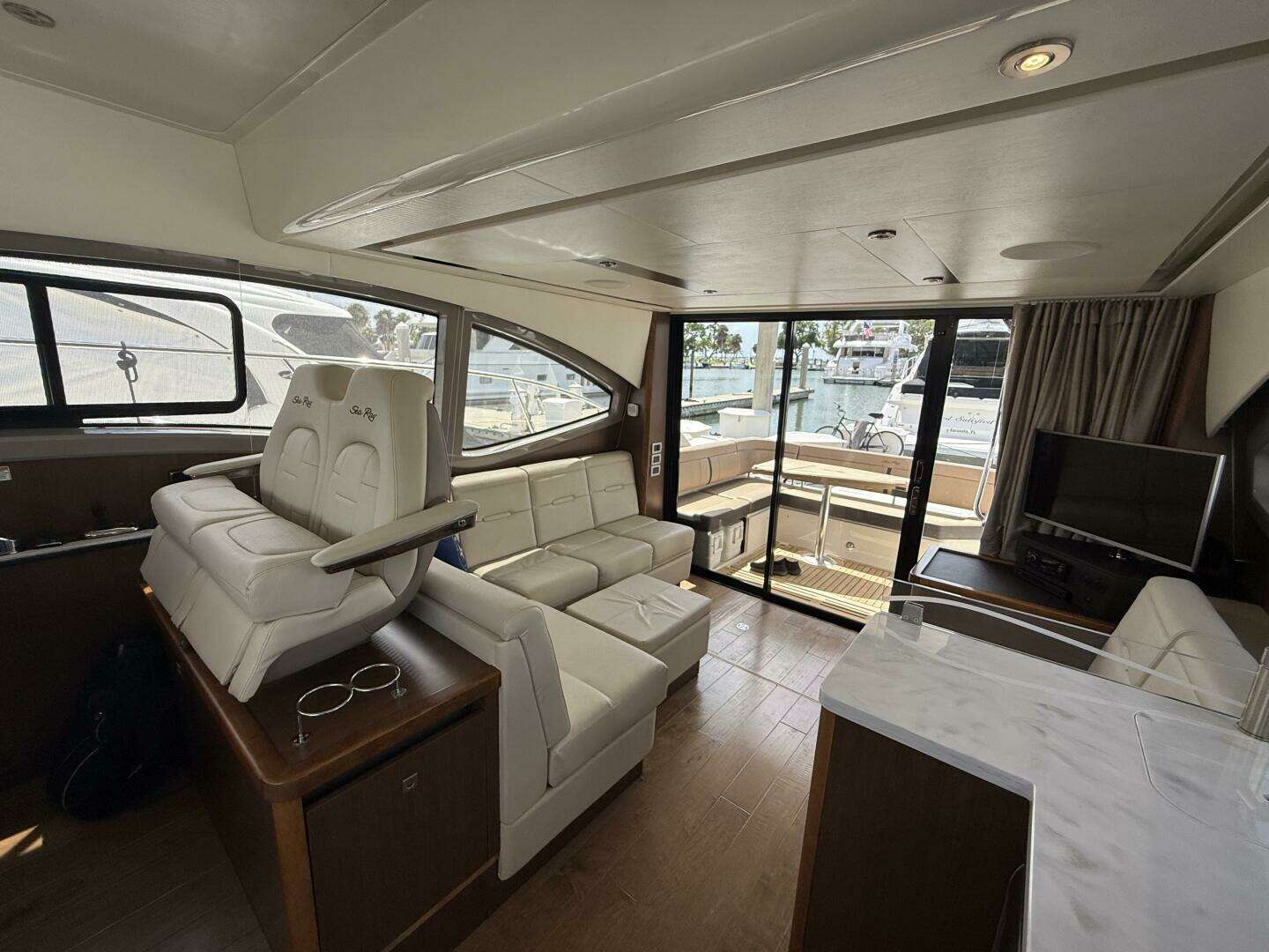 Once in the salon you will be amazed at how large the interior feels due to the smart use of space and large windows. The opposing salon sofas create the perfect conversation area for those times you prefer to entertain inside. There is a fully equipped galley for preparing meals on board to port, and to starboard you have the lower helm, for those days that you prefer to run the vessel from the climate controlled interior. The lower helm is also fully equipped with twin Raymarine screens, joystick docking, and more.