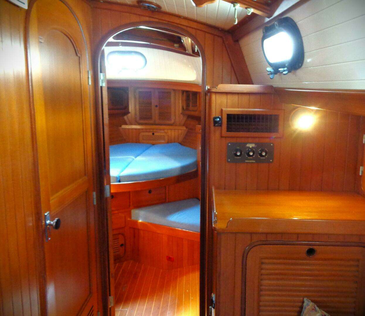 Entering the companionway from a well-protected cockpit, and you will find the Key-Hole galley to port. To starboard is an enclosed stateroom with double quarter berth and dressing area with mirrored cupboard, hanging locker and storage drawers.