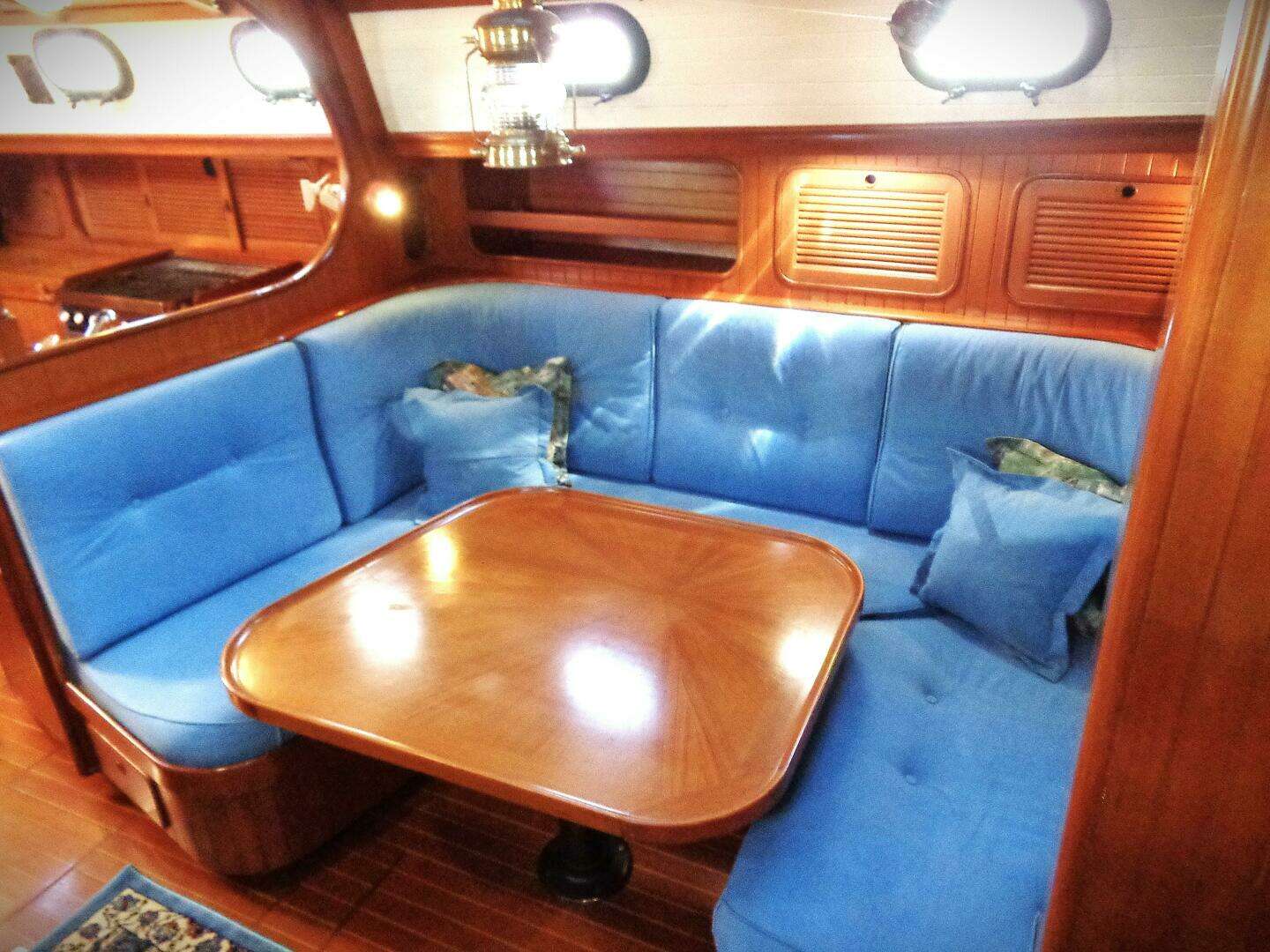 Forward of the aft stateroom on the starboard side is an aft-facing nav station. Under the nav station is an enclosed Spectra watermaker. A settee is forward of the nav station on starboard that can serve a passage bunk in heavy weather. Across on port side is a large dinette with seating for six-plus around a table with a beautiful wood-grain design. Forward of the dinette on port is the entrance to the large head with sink/vanity and separate shower with seat. Plumbing has been modified for ease of flow and maintenance. On entering the forward stateroom you will find another hanging locker to starboard with dressing seat and drawer storage and shelf space The roomy double V-berth has storage on both sides and storage underneath. Beautiful teak runs throughout the interior of this fine well-equipped vessel. 4 Deck prisms add natural light down below and 15 opening ports and 2 deck hatches (1 butterfly hatch in main salon) provide excellent ventilation and light.