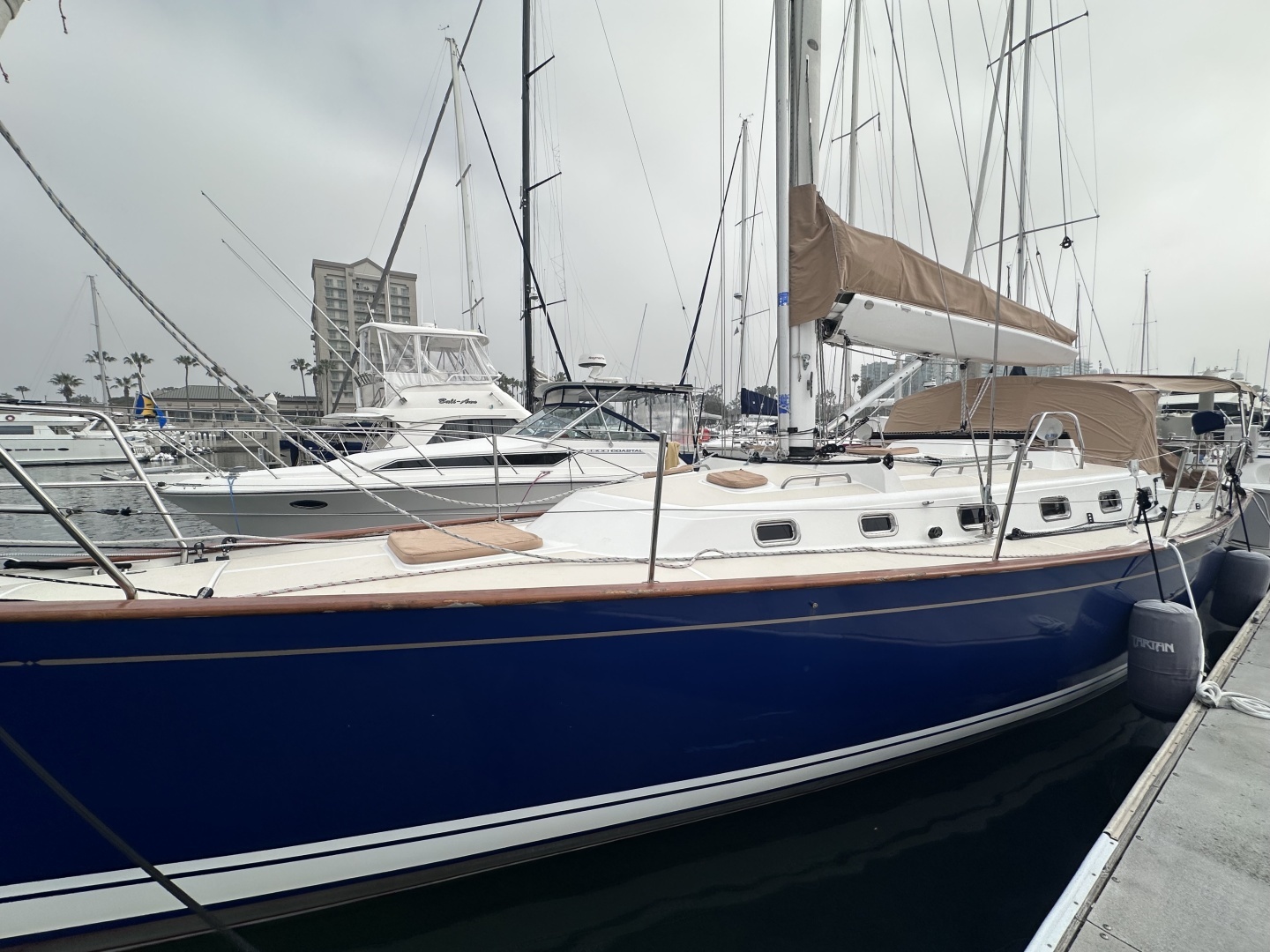 This is a one owner boat custom built with everything for the Southern California sailor. This boat is well equipped for cruising or racing Bow thruster Raymarine gps and radar Raymarine VHF w/ AIS Raymarine autopilot with remote at nav station Harken electric winches Forespar whisker pole with mast storage mount 100% self tacking jib Asymmetrical UK Spinnaker 155% UK reacher 150% UK performance head sail Stack pack Custom metallic aristo blue hull paint New canvas 2025 including Bimini Electric fresh water heads Plus much more. Owner his all service records From the manufacturer: The Tartan 4000 design embodies all of the recent Tartan leading technologies and advanced performance cruising conveniences. CCR (Cruise Control Rig), carbon fiber mast, boom and rudder, infused BPA epoxy composite hull and deck, all lead low center of gravity bulb keels give cruising performance advantages that other builders cannot match. Of course Tartan is known for the finest interior joinerwork and creative interior arrangement plans. The 4000 features handcrafted, solid stock cherry cabinetry befitting the finest sailing yachts built in America. The beauty of her varnished solid stock cabin sole is simply striking. This is not your cookie cutter production interior found in mass-produced boats. The forward cabin is dedicated as the owner's stateroom. It is opulently appointed with tongue and groove cherry hull sealings, extensive cabinetry, island berth and ensuite head with stall shower. Her main cabin is the social center of the interior with comfortable sofa seating, a drop leaf table and furniture grade cabinets. The cook will enjoy a galley that has been optimized to include thoughtful storage, extensive counter space, top and front access icebox and the best in marine appliances. The nav station is the center for on board systems control. The engineered electrical system and navigation equipment all have their place and are conveniently located for operation.Aft, the 4000 is available in a single second cabin layout with large cockpit access storage or as a split 2 cabin arrangement. On deck the 4000 features details that deliver good looks, comfort and security. Wide side decks and molded bulwarks with a solid teak caprail provide safe and secure movement fore and aft.Ventilation on a Tartan is second to none, and the 4000 continues this tradition with all opening stainless steel houseside portlights, cockpit portlights, stainless steel deck hatches and 4 stainless steel dorade ventilators with stainless guards. Stainless steel handrails running the length of the housetop within easy reach, provide safe on deck maneuvering in the roughest conditions. The cockpit is all about comfort and convenience. A twin wheel layout provides easy centerline access aft to the hinged boarding/swim platform and also places the helmsman in a great sailing position. The seats are contoured for comfort and flank a stowable teak cockpit table. The 4000 represents Tartan's latest in performance cruising. Hand crafted in America, she is a fitting addition to the 50-year heritage of Tartan Yachts.